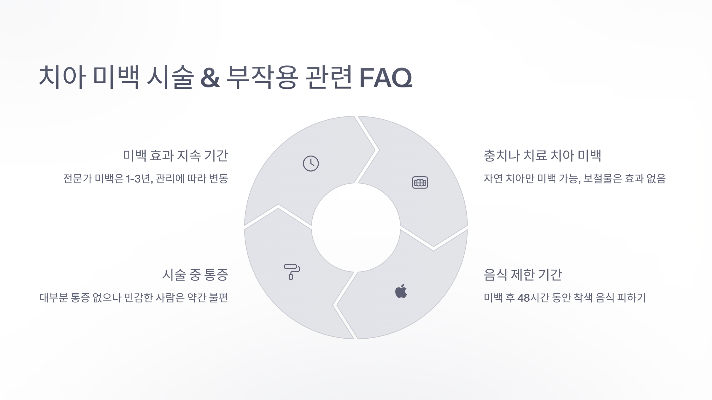여기까지 읽으셨다면, 정말 꼼꼼하게 미백 준비하고 계신 거예요! 😊 마지막으로, 지금까지 자주 들어온 치아 미백 관련 FAQ 8가지를 정리해서 알려드릴게요.