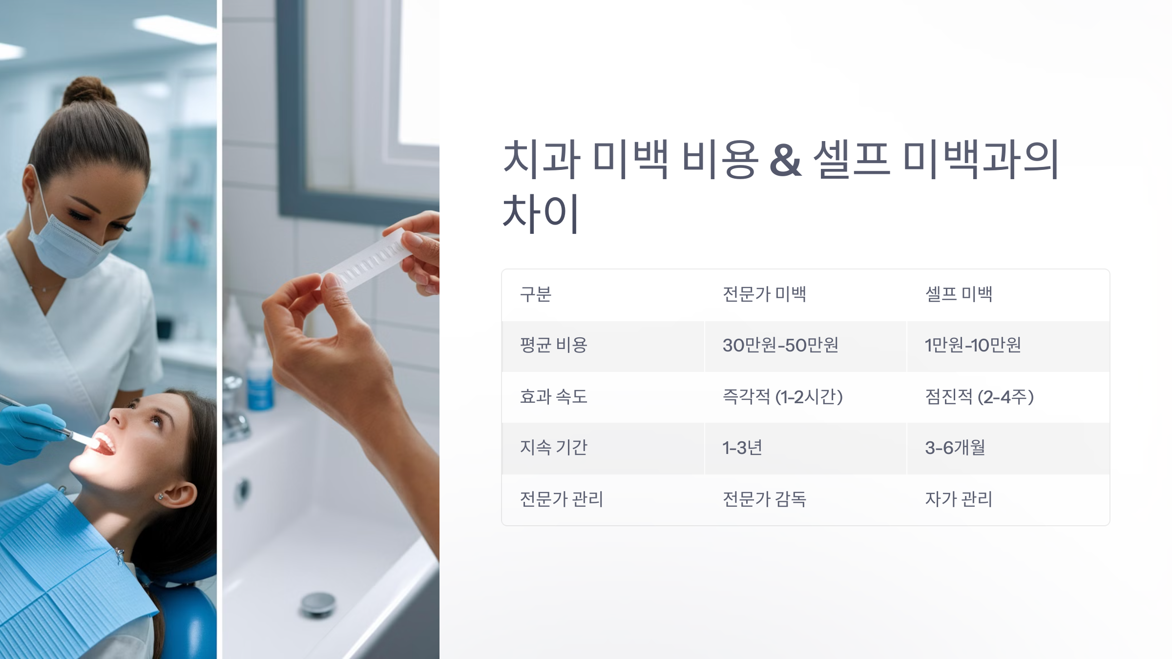 결론은, 정해진 방법대로 시술하고 제대로 관리하면 부작용은 크게 걱정하지 않아도 돼요! 이제 많은 분들이 궁금해하는 비교 포인트, 치과 미백 vs 셀프 미백 이야기로 넘어갈게요 ⚖️
