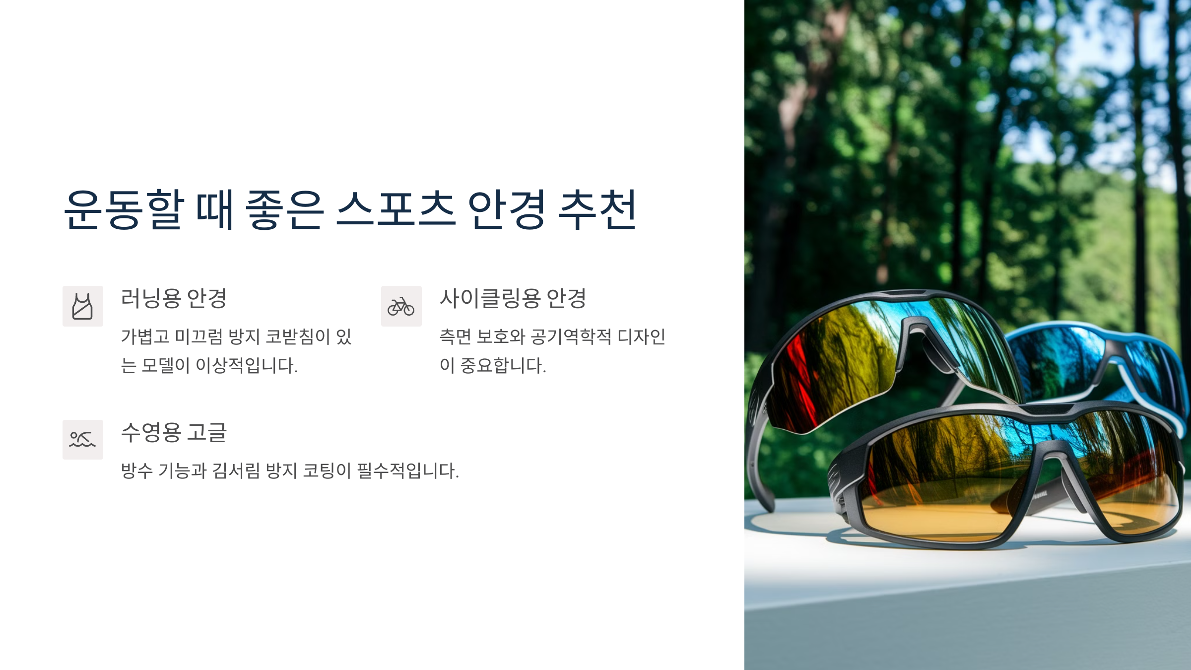 이제 어떤 프레임을 골라야 할지 감이 좀 오죠? 다음 섹션에서는 활동성과 스타일을 모두 잡는 ‘스포츠 안경’을 소개할게요! 🏃♂️