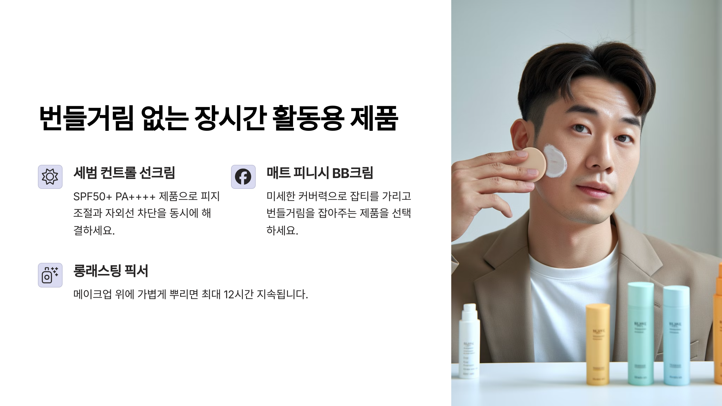 출근해서 퇴근까지, 피부가 번들거리면 신경 쓰이죠. 특히 여름철이나 외근 많은 분들은 유분 조절이 핵심이에요. 그래서 '피지 컨트롤' 기능이 포함된 젤 타입이나 수분 에센스를 추천해요.