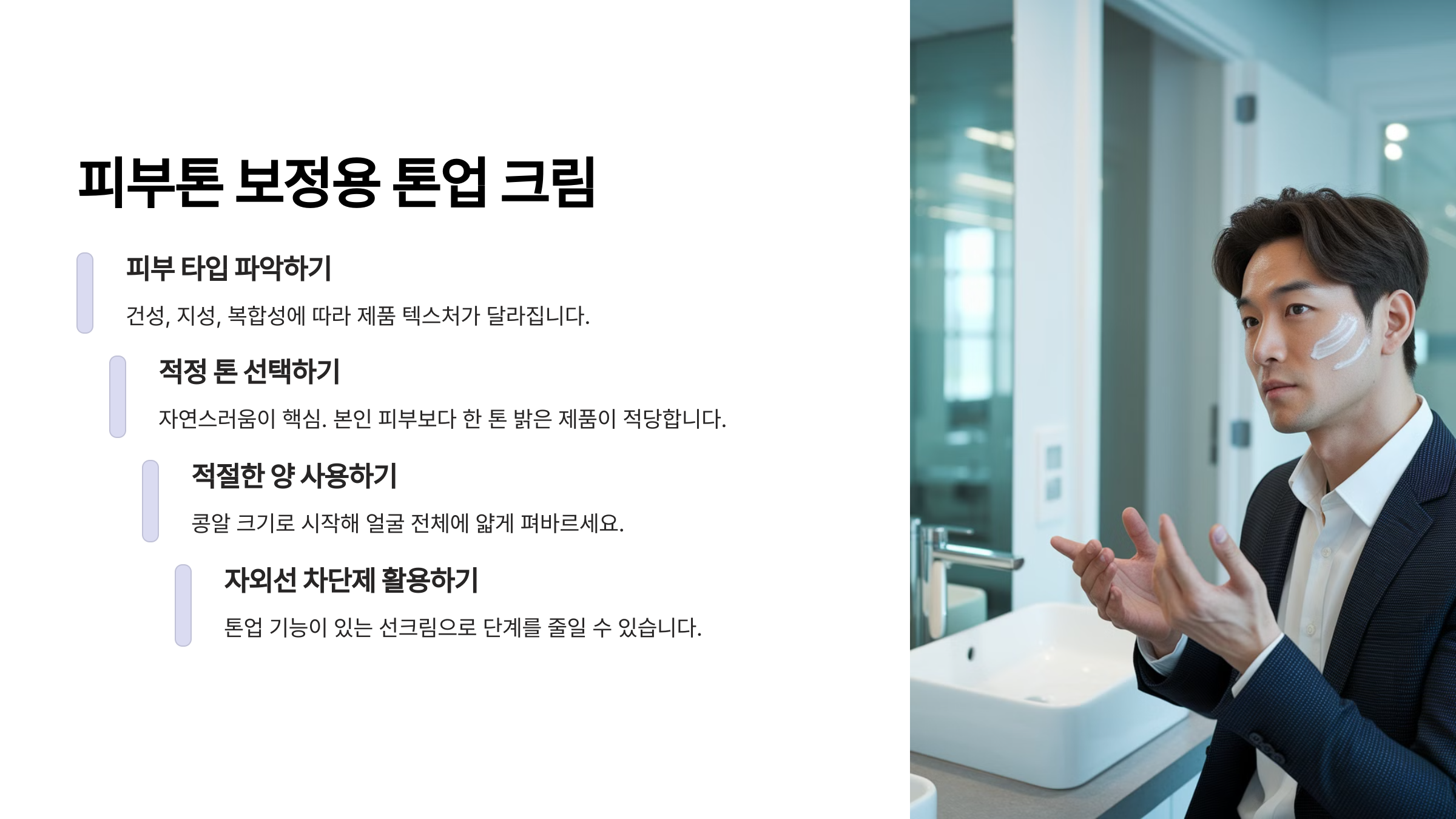 가볍게 바를 수 있고 티도 안 나서, 남자들이 쓰기에 딱 좋은 화장품이에요. 나만 아는 은근한 디테일, 그게 인상을 좌우하죠 😎