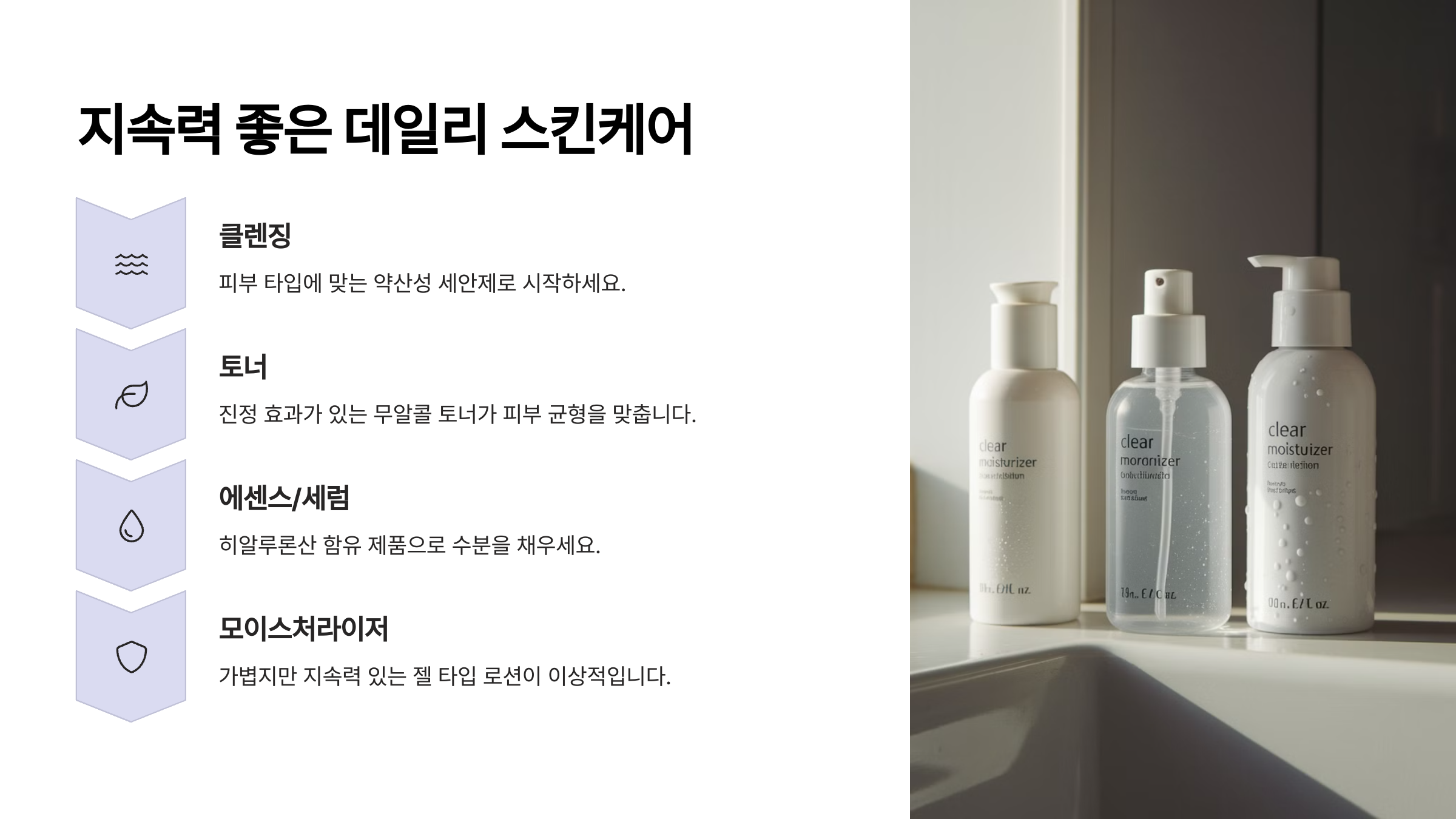 보습은 단순히 수분만 채우는 게 아니라, 수분이 날아가지 않도록 보호막을 형성해주는 제품이 필요해요. 젤 타입보다 크림 타입이 오래 유지되며, 겨울철에는 오일 한 방울 정도 섞어 쓰는 것도 방법이에요.
