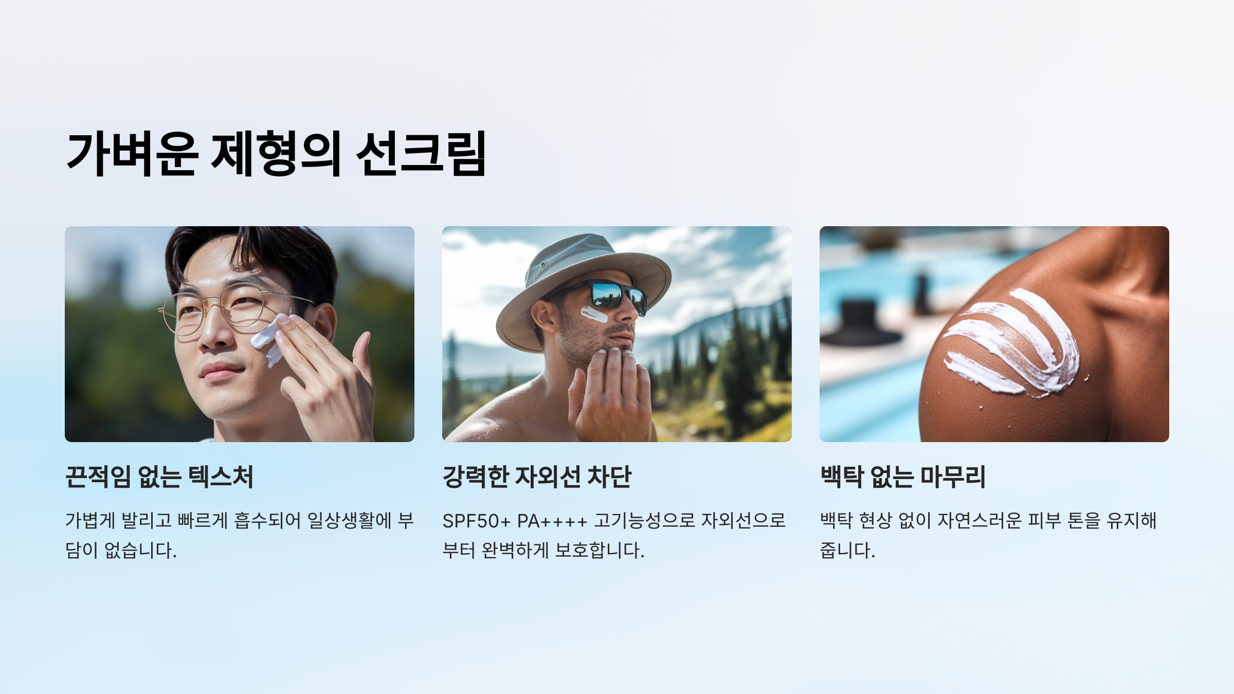 특히 남성들은 피부에 유분이 많고 털이 있기 때문에 무겁거나 백탁 있는 선크림은 답답하게 느껴질 수 있어요. 이럴 땐 워터베이스나 젤타입, 무기+유기 혼합형 제형이 부담 없이 바를 수 있어서 좋아요.