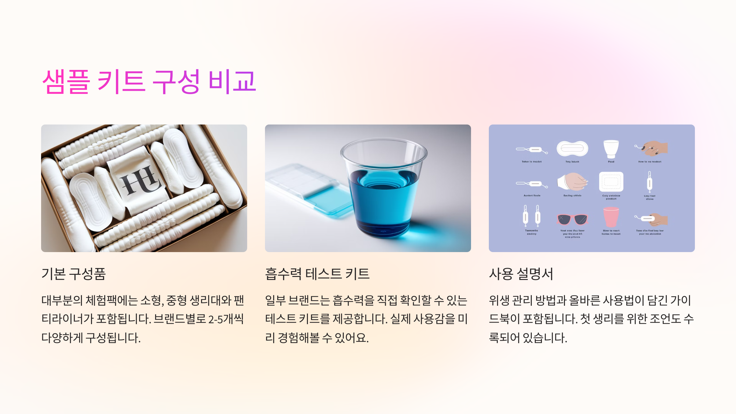 A1. 대부분의 브랜드는 무료로 제공하거나 배송비만 부담하면 체험팩을 받을 수 있어요. 라엘, 해피문데이, 좋은느낌 등이 대표적이에요.