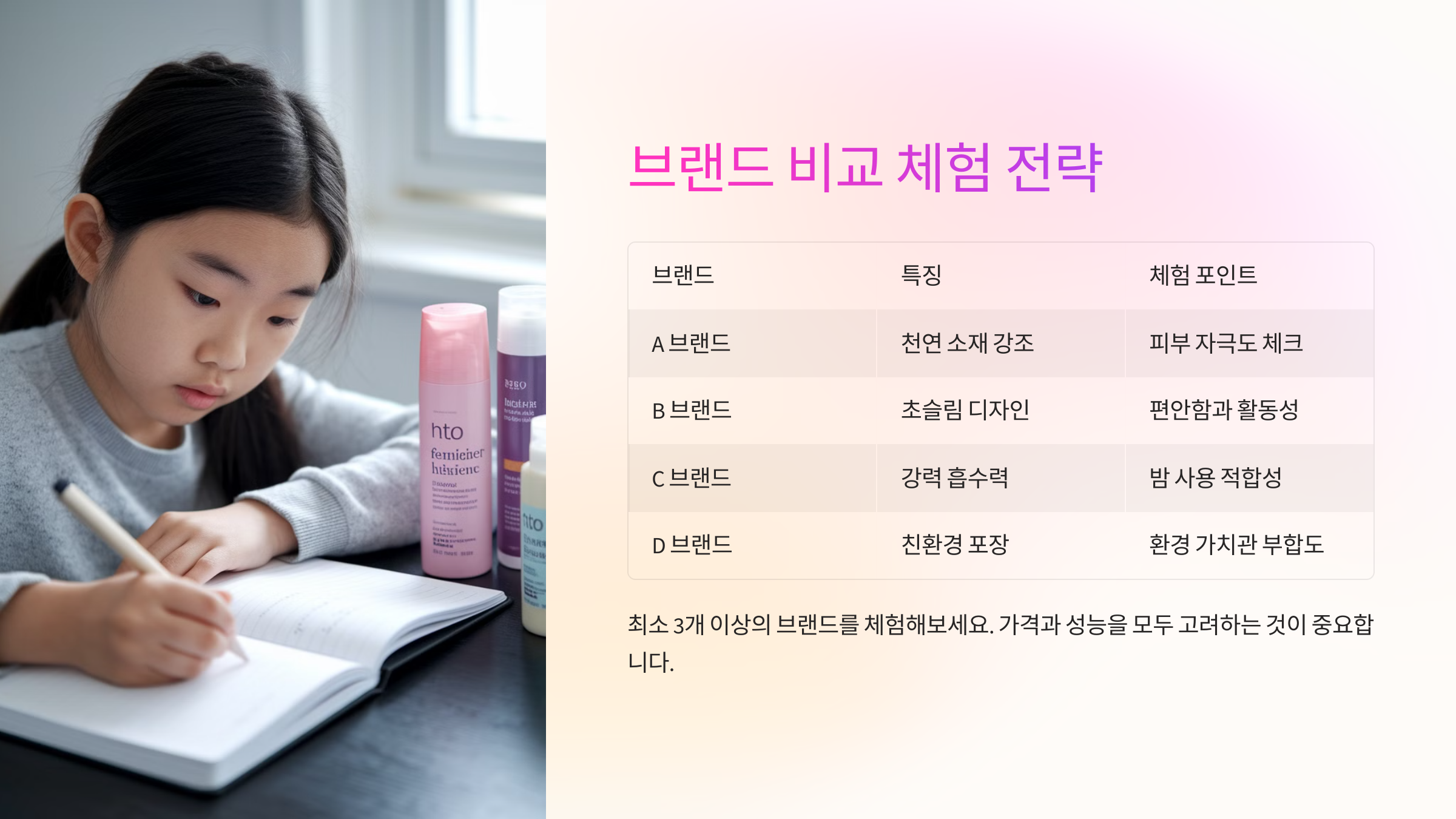 🎯 다양한 브랜드를 비교하며 체험하는 과정은 우리 아이에게 ‘자기 몸에 관심을 갖는 법’을 가르쳐주는 귀중한 교육의 기회가 되기도 해요.