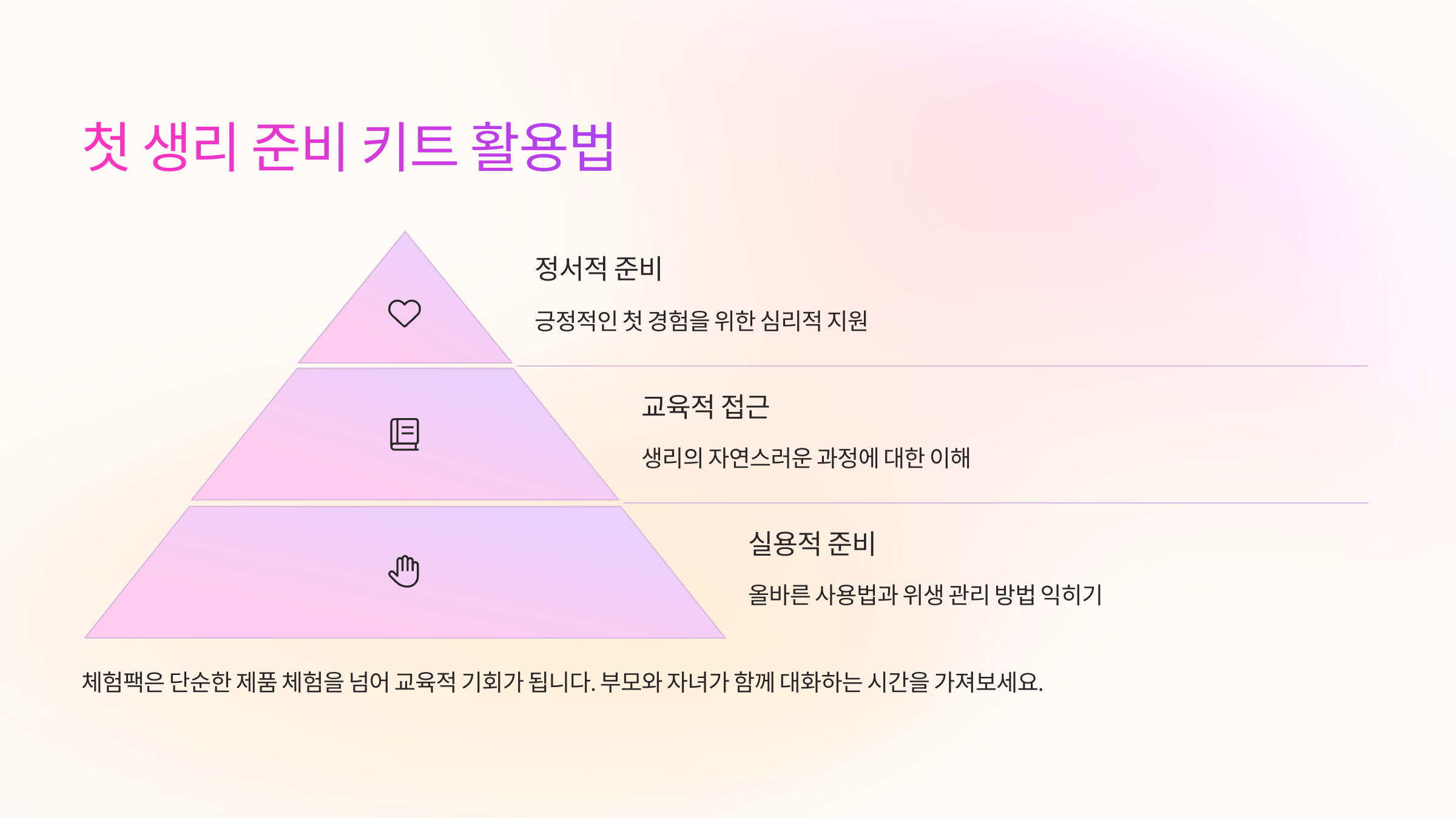 첫 생리는 우리 아이에게 커다란 신체적 변화이자 감정의 전환점이에요. 그래서 단순한 생리대 체험팩을 넘어서, '첫 생리 준비 키트'로 구성해 주면 훨씬 의미 있는 경험이 될 수 있어요. 단지 생리대를 넣는 게 아니라, 아이의 불안을 줄여주고 궁금증을 해소해주는 구성으로 만드는 거죠. 🎀