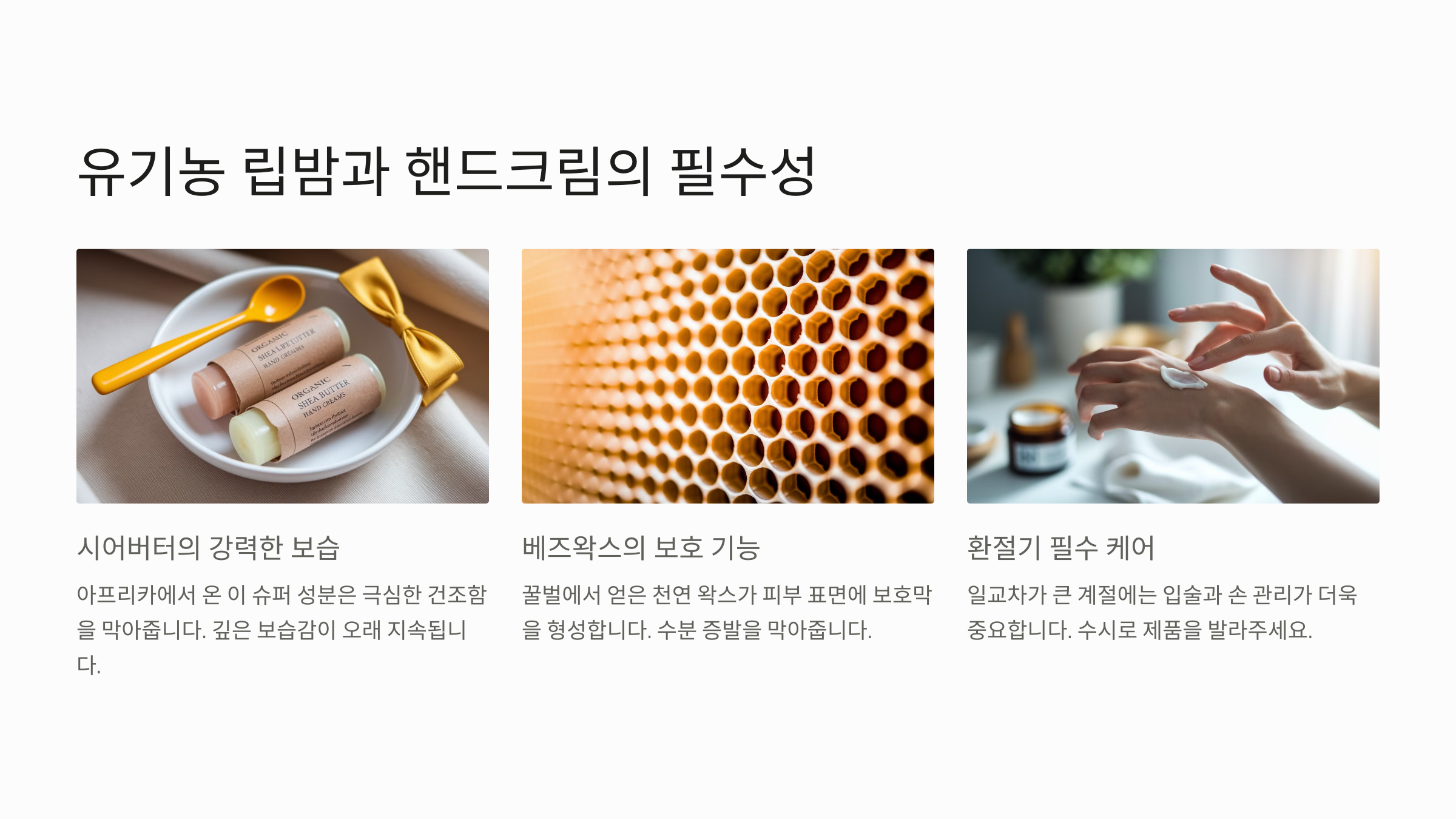 피부만큼이나 환절기에 민감하게 반응하는 부위가 바로 입술과 손이에요. 바람과 건조한 공기에 노출되기 쉬운 만큼, 유기농 립밤과 핸드크림도 챙겨줘야 해요. 매일 사용되는 제품일수록 성분이 더 중요하다는 거, 알고 계시죠?