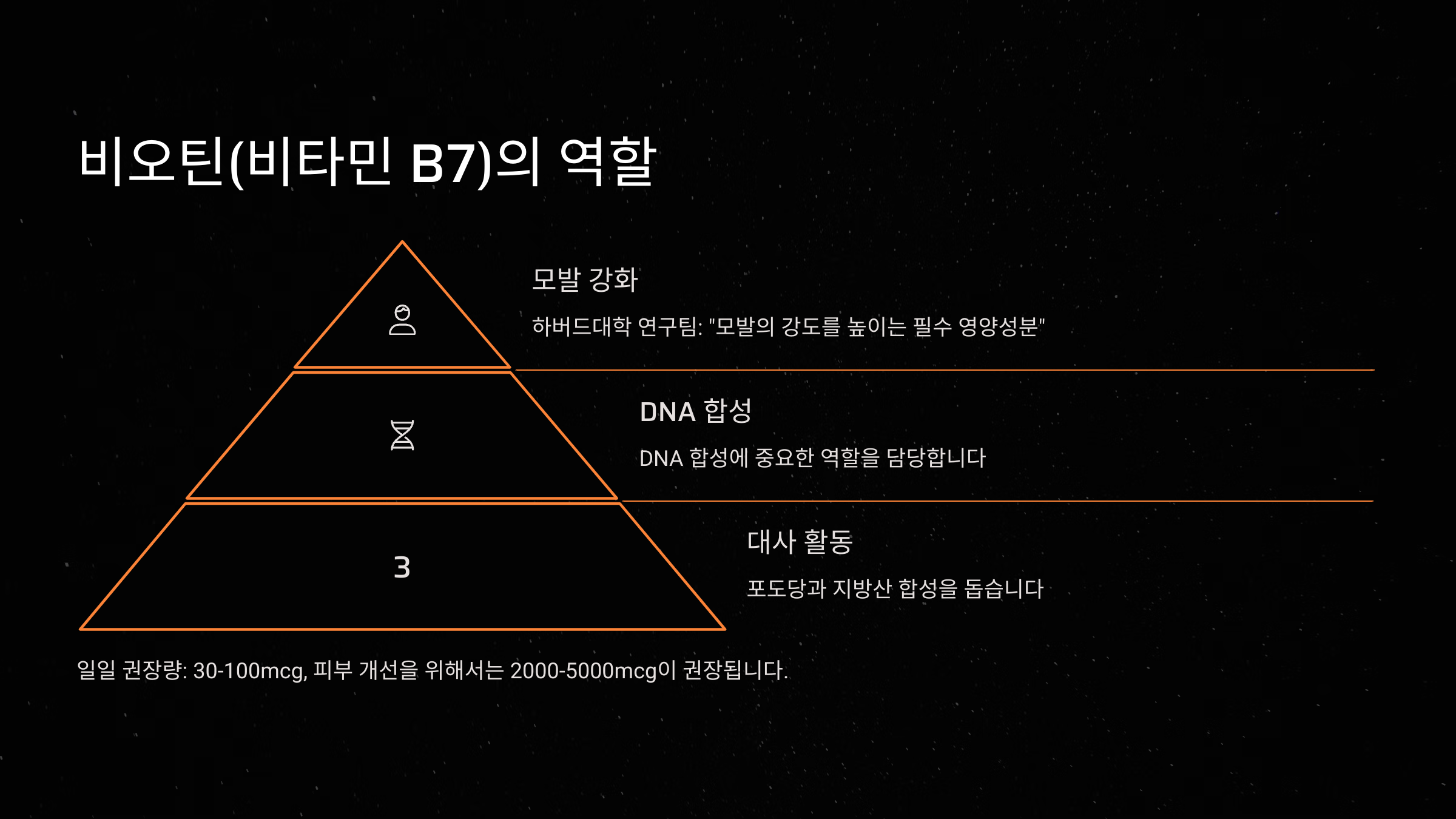 비오틴은 비타민 B군 중 하나로, 모근 세포의 에너지 생성과 효소 작용에 꼭 필요한 영양소예요. 비오틴이 부족하면 모발이 가늘어지고 쉽게 끊어지거나 빠질 수 있어요.