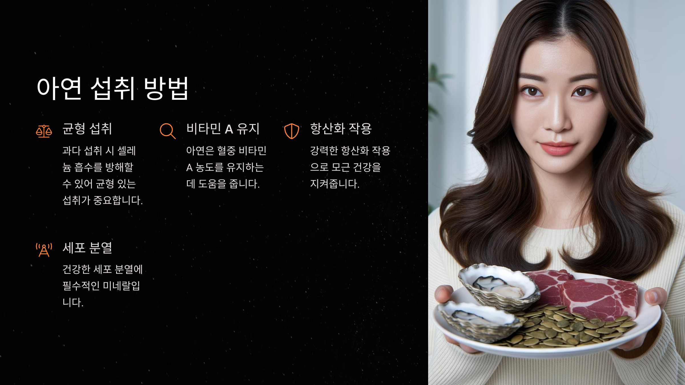 아연은 체내 저장이 어려운 성분이라 매일 식사나 영양제로 꾸준히 섭취해줘야 해요. 과잉 섭취하면 구토나 복통이 생길 수 있으니 하루 8~11mg 정도를 권장해요.