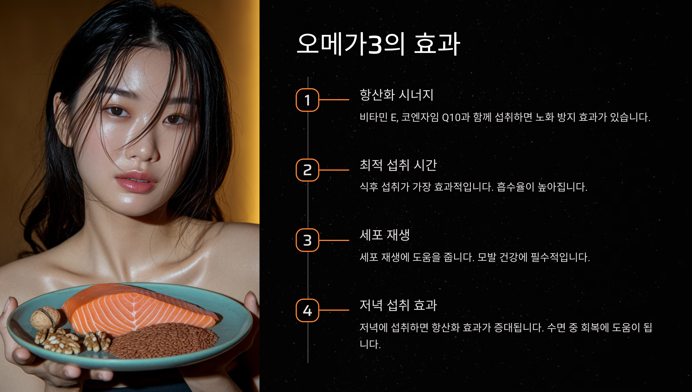 오메가3는 식후 섭취가 좋아요. 기름과 함께 섭취되면 체내 흡수율이 더욱 올라가거든요. 저녁 식사 후 챙겨 먹으면 좋아요.
