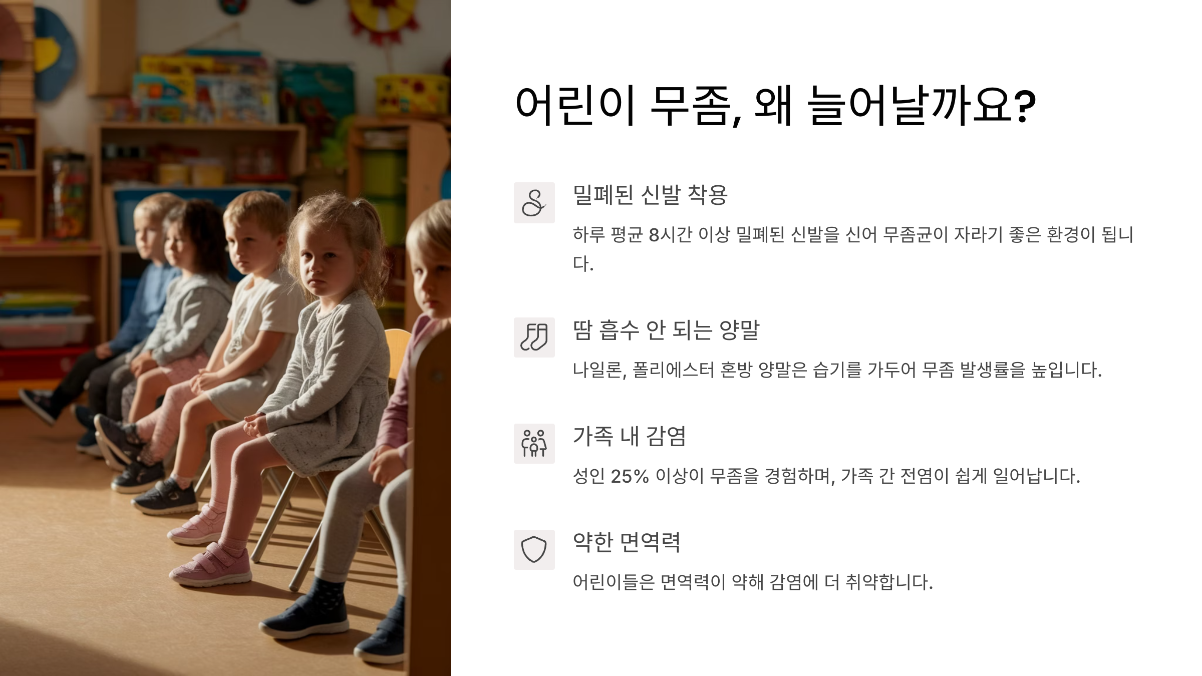 이처럼 학교와 유치원은 환기가 어렵고, 청결 관리가 완벽하지 않은 곳도 있기 때문에 부모의 관심과 예방 습관 교육이 무엇보다 중요해요. 아이 스스로 발 위생을 챙기기엔 아직 익숙하지 않거든요.