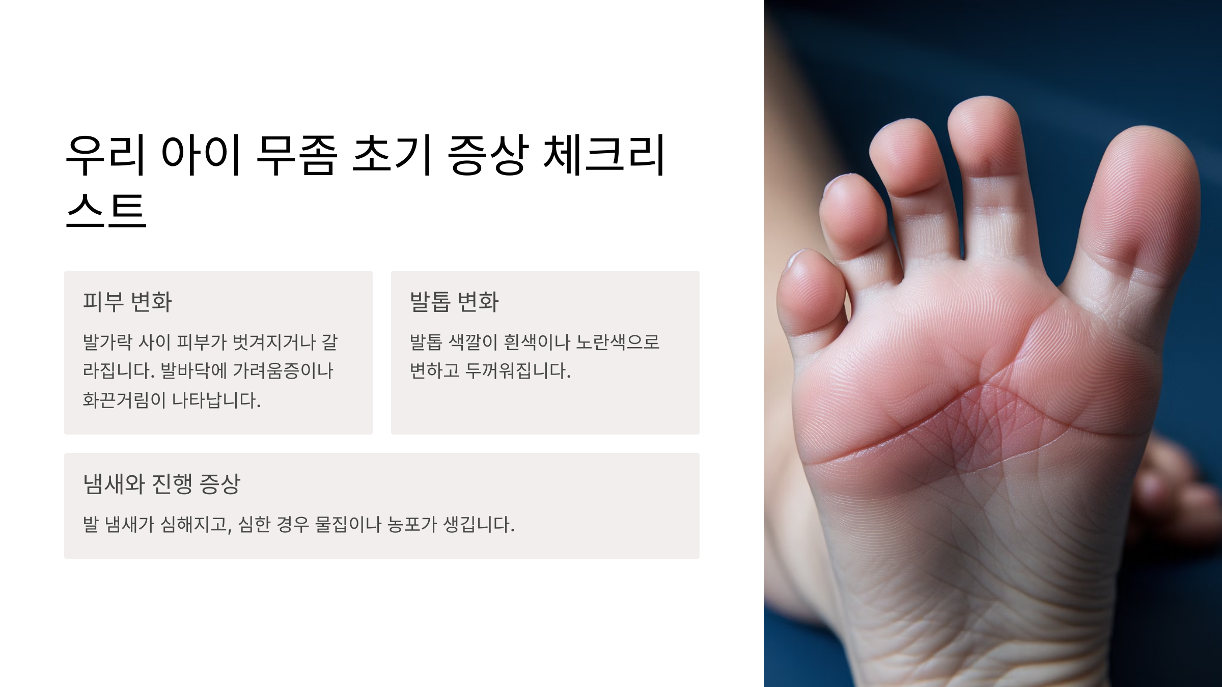 초기에 발견하면 쉽게 치료할 수 있지만, 방치할 경우 발가락 사이가 갈라지거나 물집, 가려움증 등 불편한 증상이 동반돼요. 아이가 자꾸 발을 긁거나 벗으려 한다면 무좀일 가능성도 고려해야 해요.