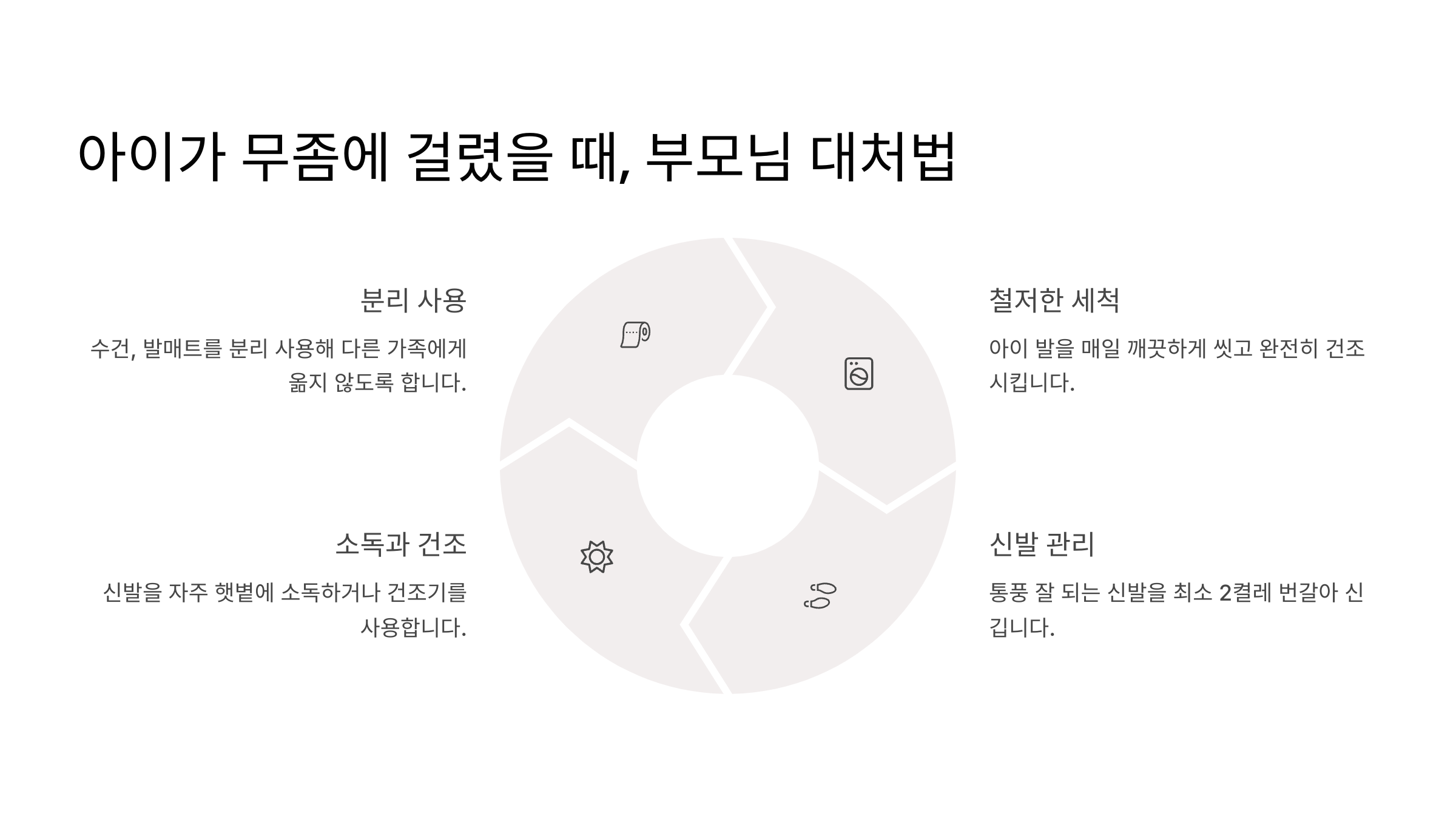 | 양말·신발 관리 | 면소재 양말, 햇빛건조 | 하루 2회 이상 교체 |