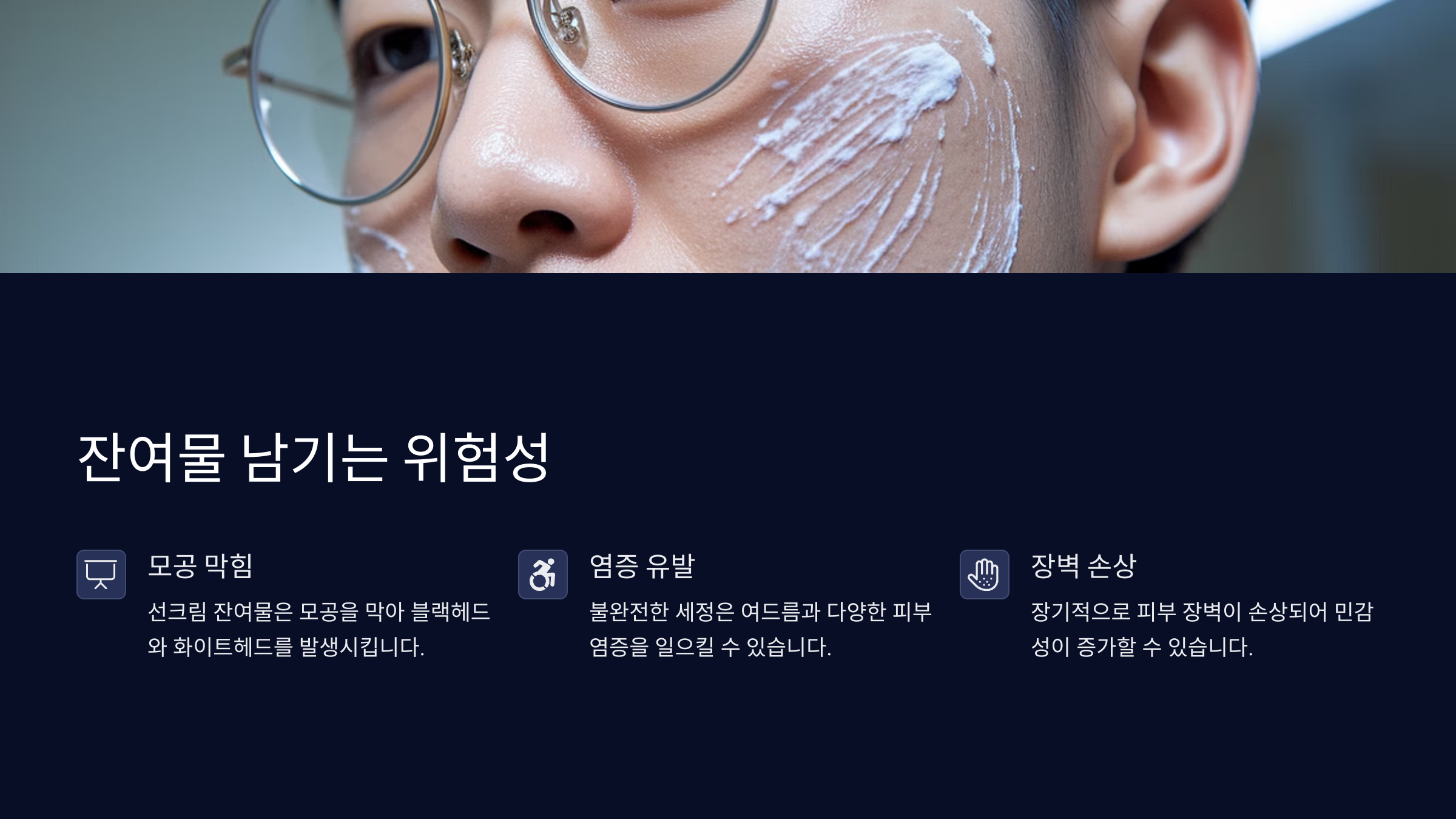 클렌징을 충분히 하지 않으면 생기는 문제는 단순한 뾰루지 정도로 끝나지 않아요. 특히 선크림은 자외선을 막기 위해 피부에 밀착되도록 설계되어 있어서, 그만큼 강한 성분과 오일이 포함되어 있는 경우가 많아요. 이 성분들이 피부에 남아 산화되면 염증, 모낭염, 피부 트러블을 유발할 수 있답니다.