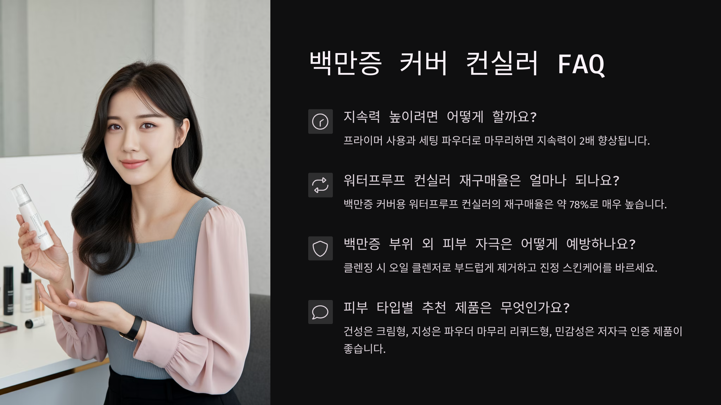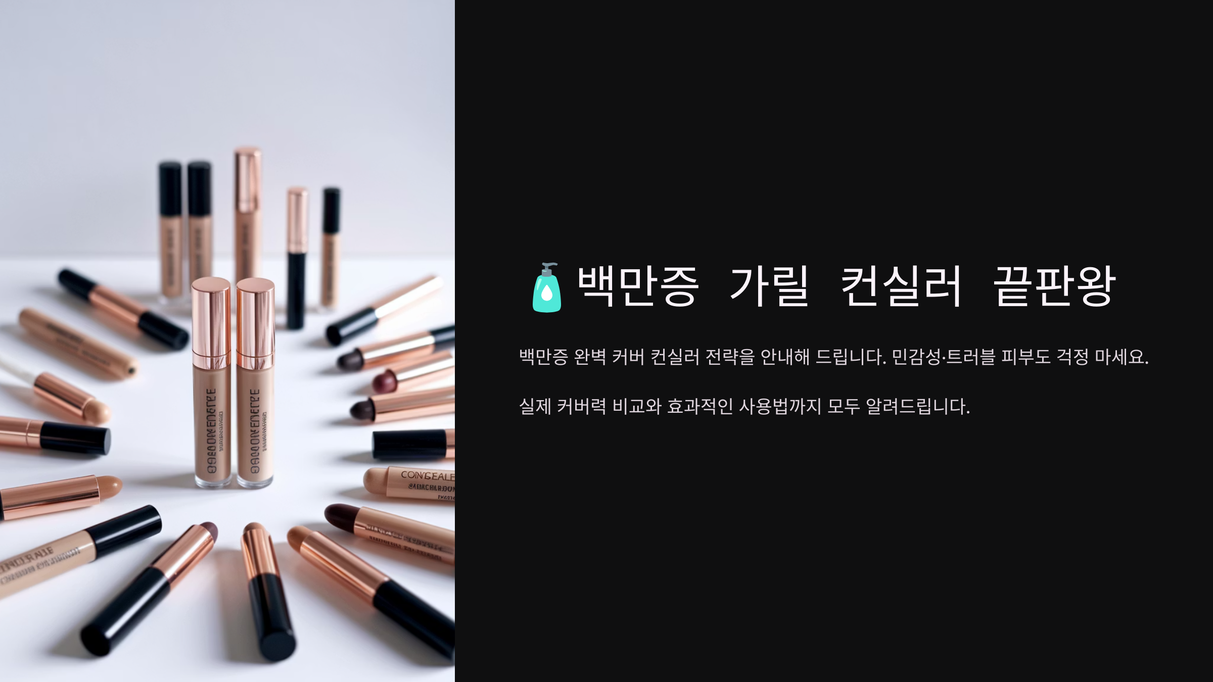 이런 피부 상태를 커버하려면 일반적인 메이크업보다는 훨씬 더 섬세한 접근이 필요해요. 오늘은 백만증 피부를 위한 컨실러 선택법부터 메이크업 팁까지 전부 알려줄게요.