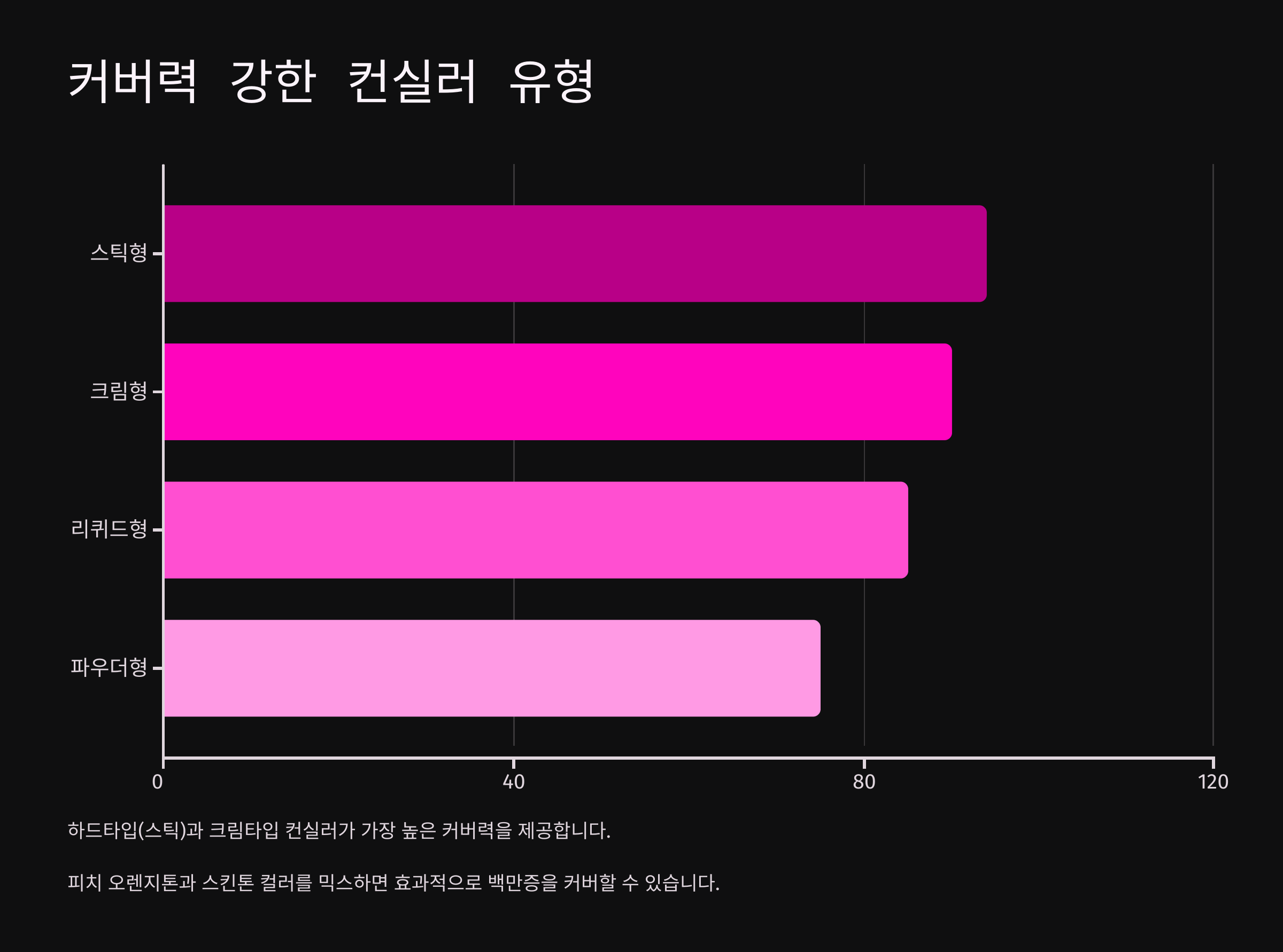 | 스틱 | 강력한 커버력, 높은 밀착 | 국소 부위 백만증 커버 |