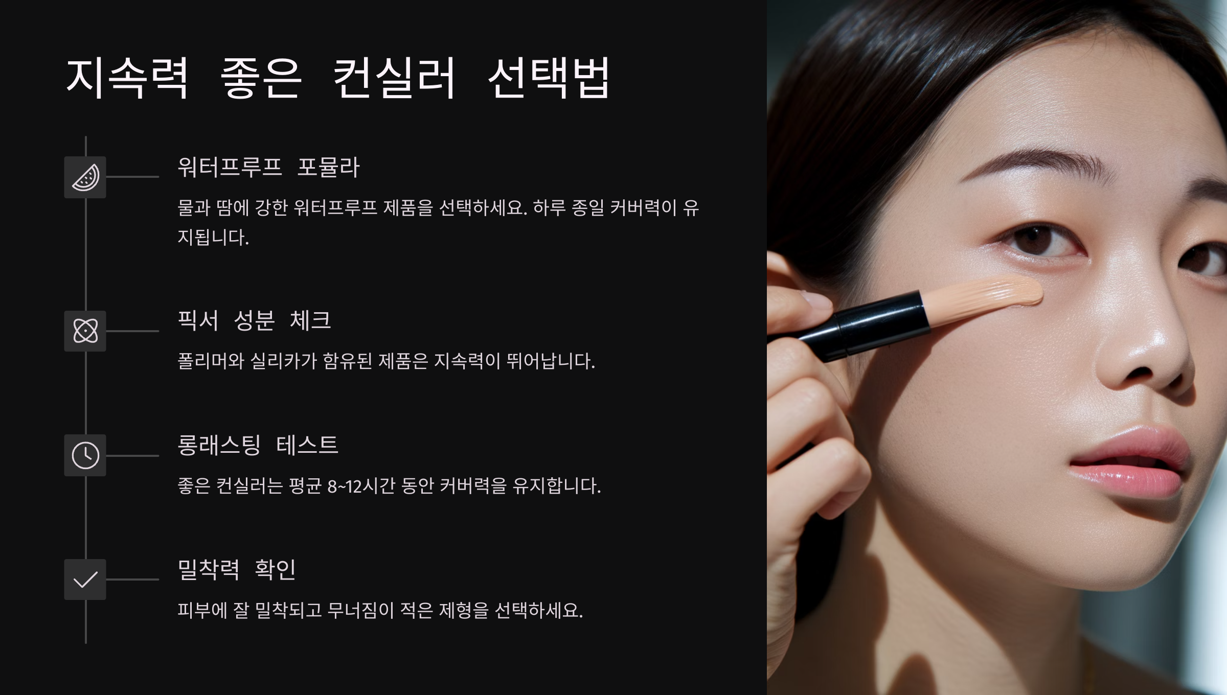 지속력 좋은 컨실러는 하루 종일 수정 메이크업 없이도 깔끔한 피부 표현을 유지할 수 있게 도와줘요.