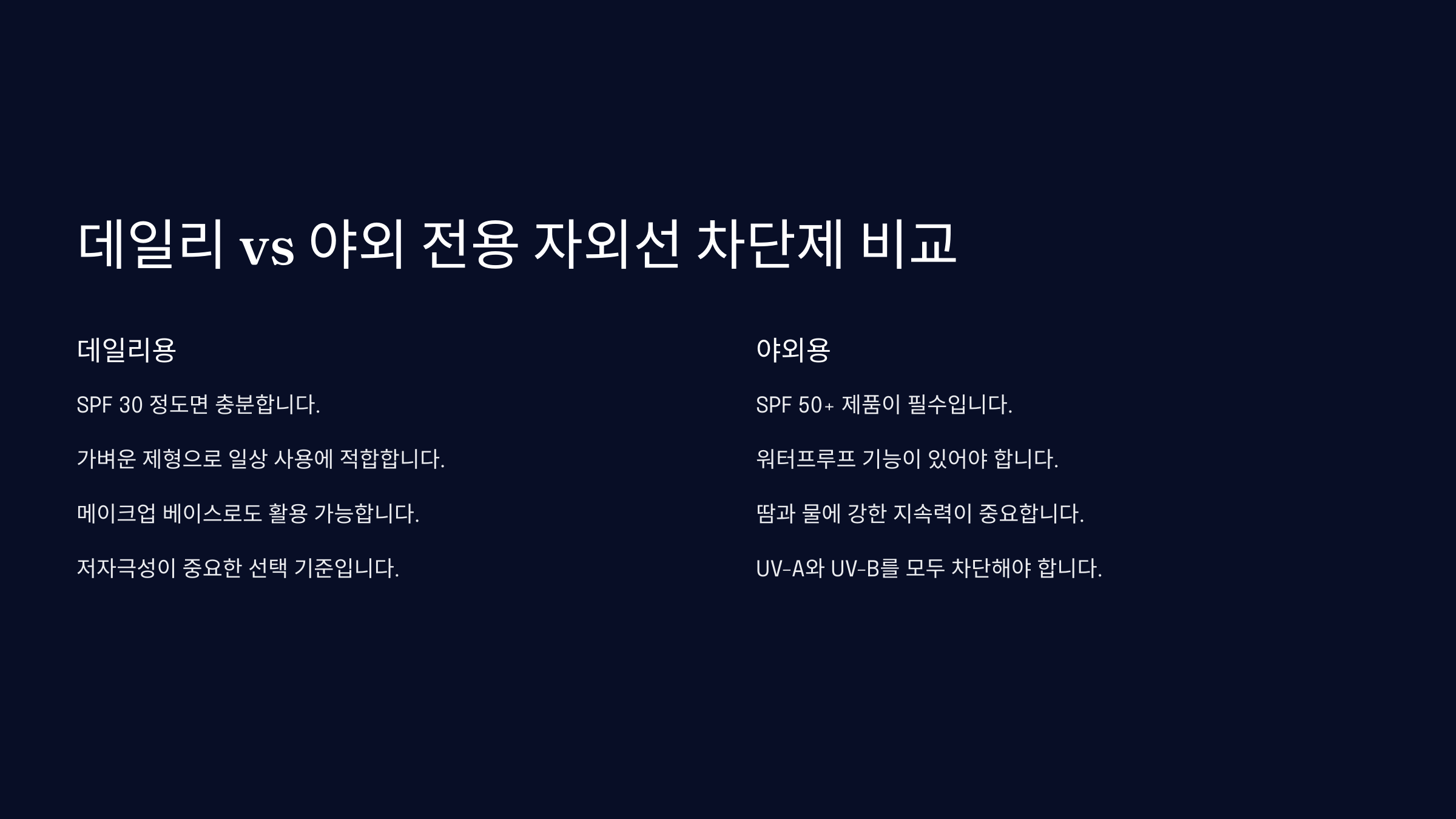 | 야외 운동·장시간 외출 | SPF 50+ / PA++++ | 워터프루프, 유기자차 |
