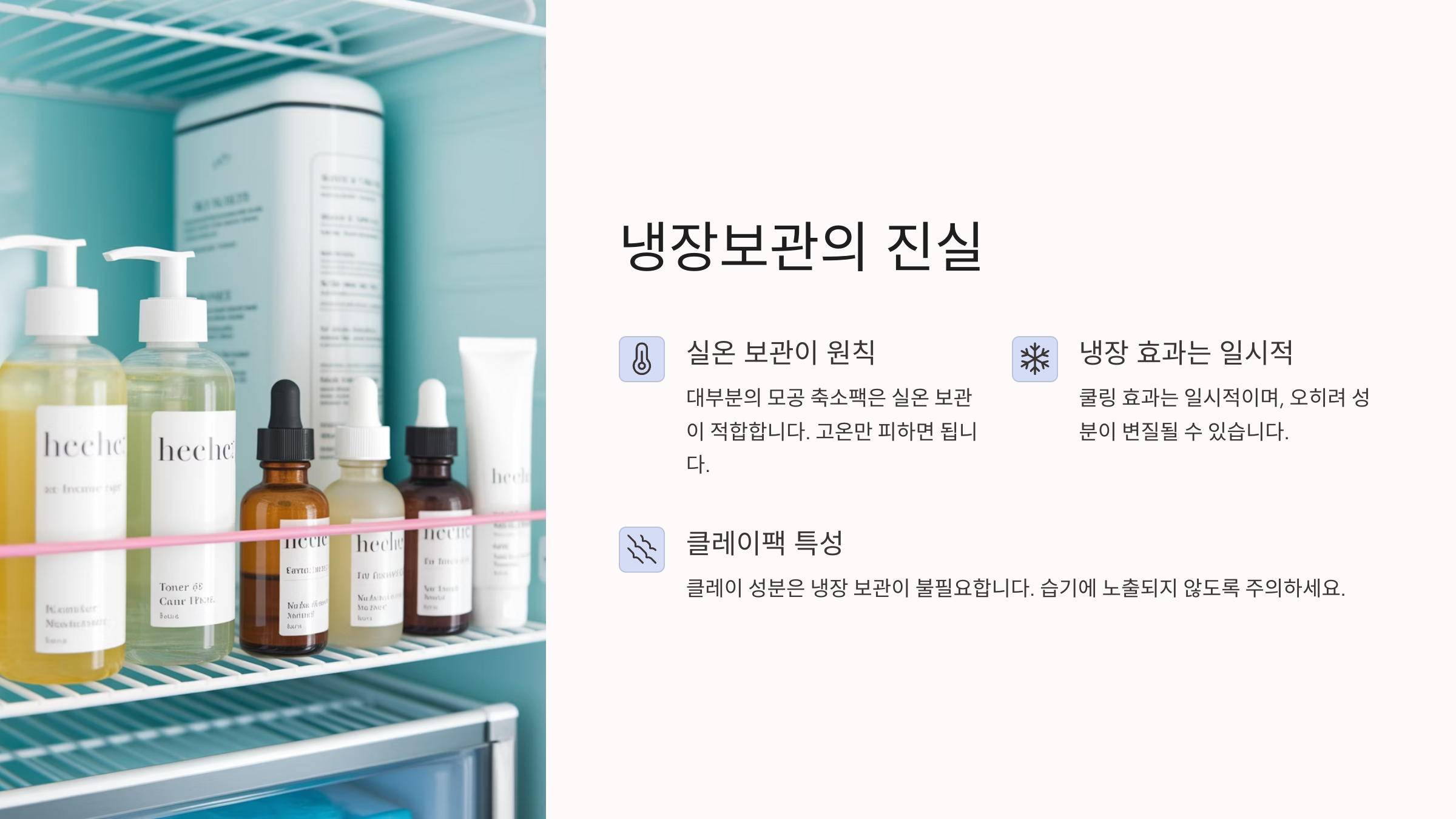 특히 **클레이팩이나 오일 베이스 제품**은 저온에 보관하면 굳거나 분리될 수 있어요. 이럴 땐 오히려 상온 보관이 더 안정적이랍니다.