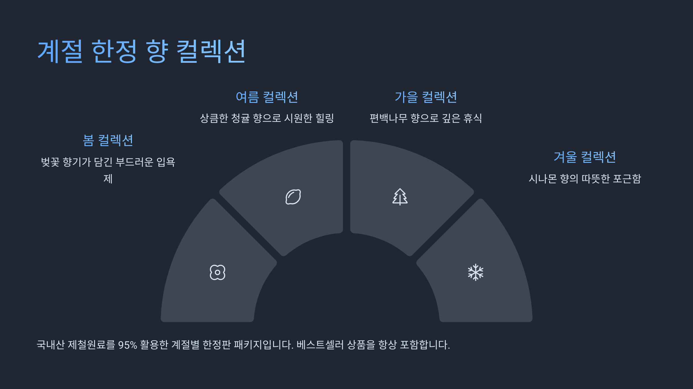 입욕제에서도 계절을 느낄 수 있다면 정말 멋지겠죠? 계절별 한정 향 컬렉션은 그런 특별함을 선물해줘요! 🍁