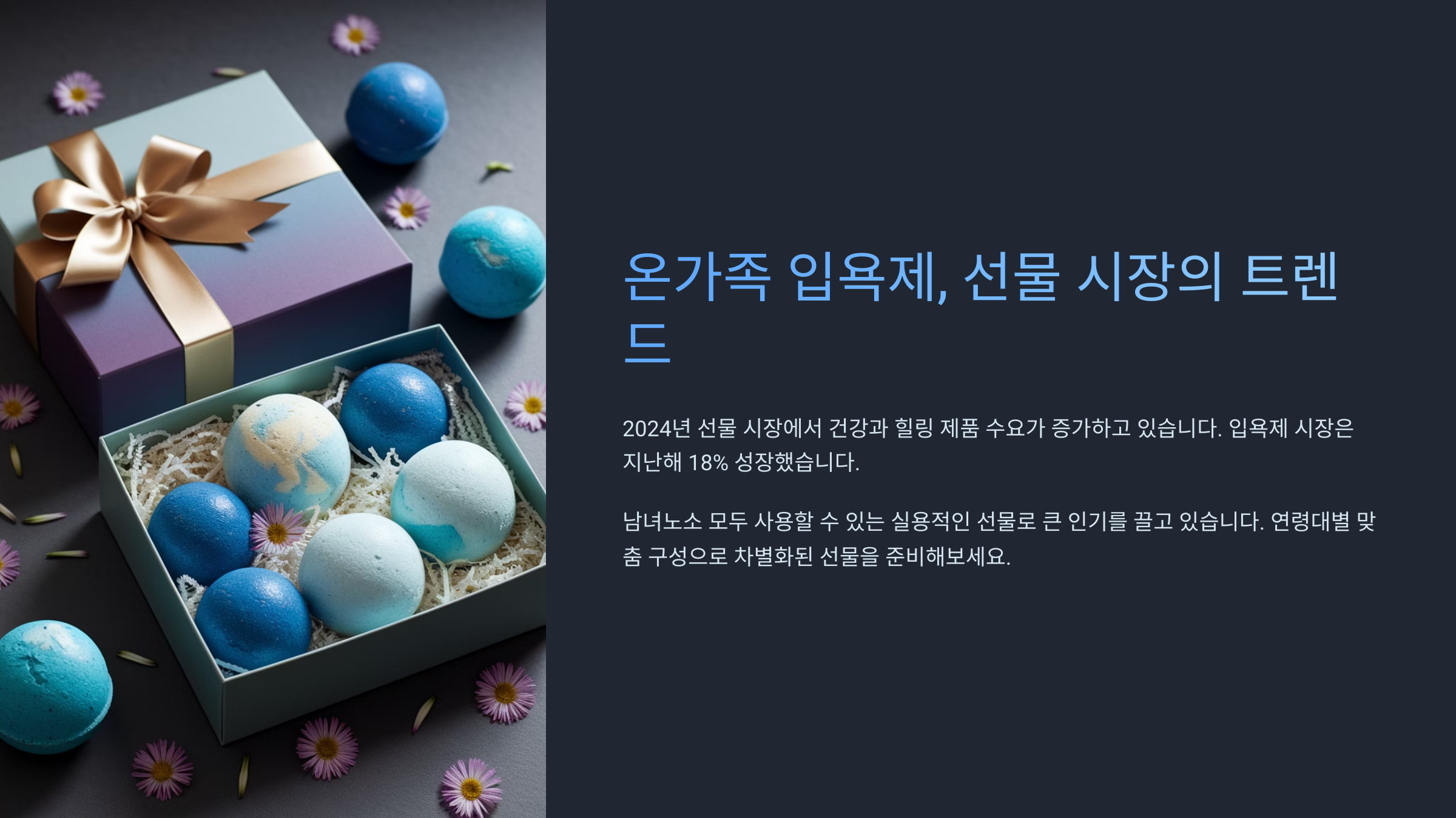 특별한 시즌, 특별한 선물을 준비하고 싶다면 입욕제가 딱이에요! 특히 크리스마스, 설날, 추석 선물로 인기 만점이에요. 🎁