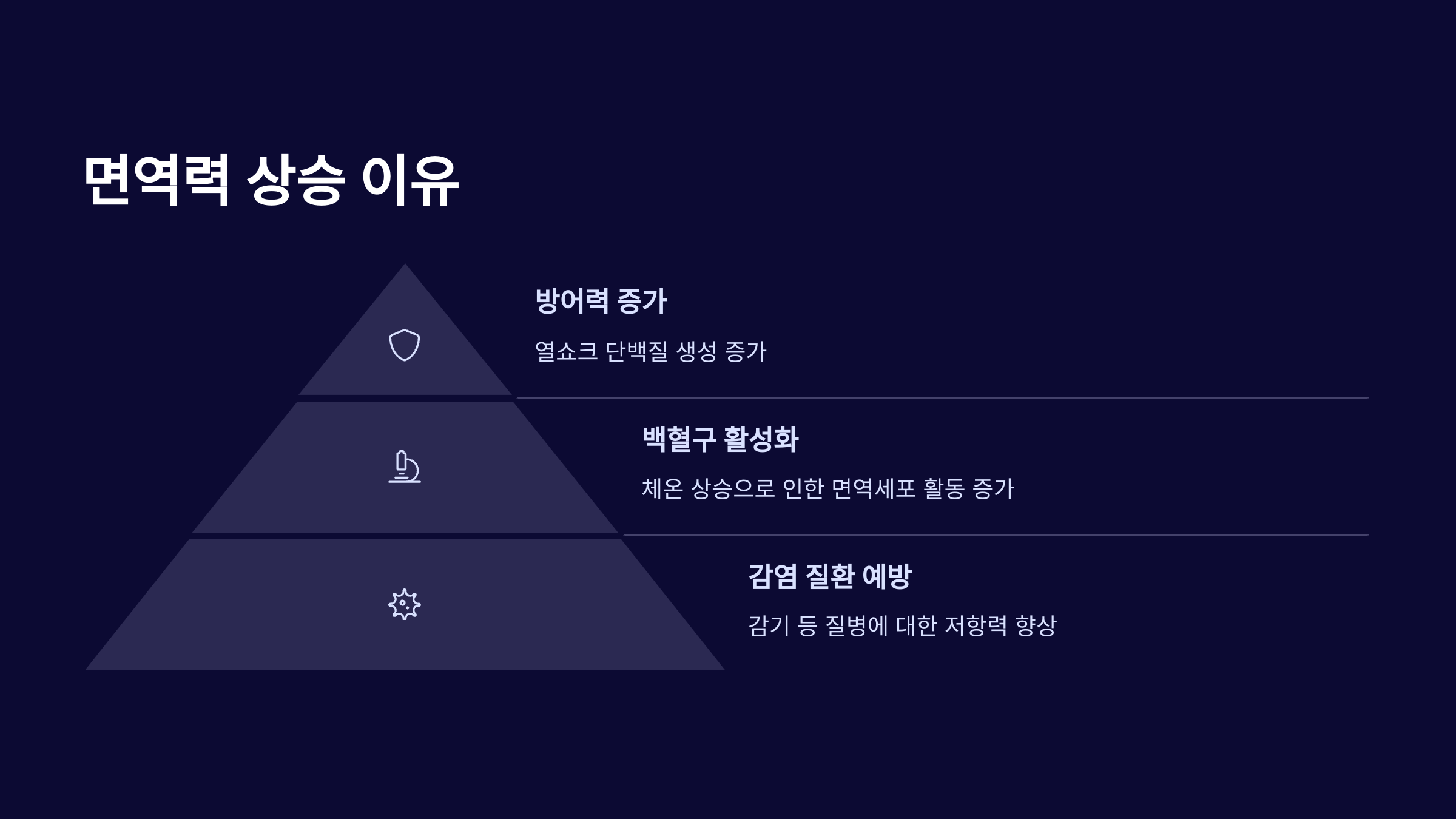 | 1. 체온 상승 | 백혈구 활동성 강화 |