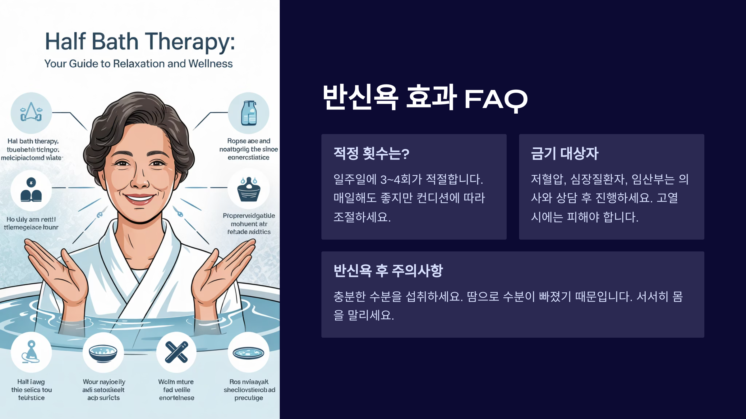 마지막으로, 반신욕 시 복부 위까지 물이 차오르면 심장에 부담을 줄 수 있으니, 항상 명치 아래까지만 물을 채워야 해요. 이렇게 하면 오히려 심장이 편안해져서 장시간 반신욕도 안전하게 즐길 수 있어요!