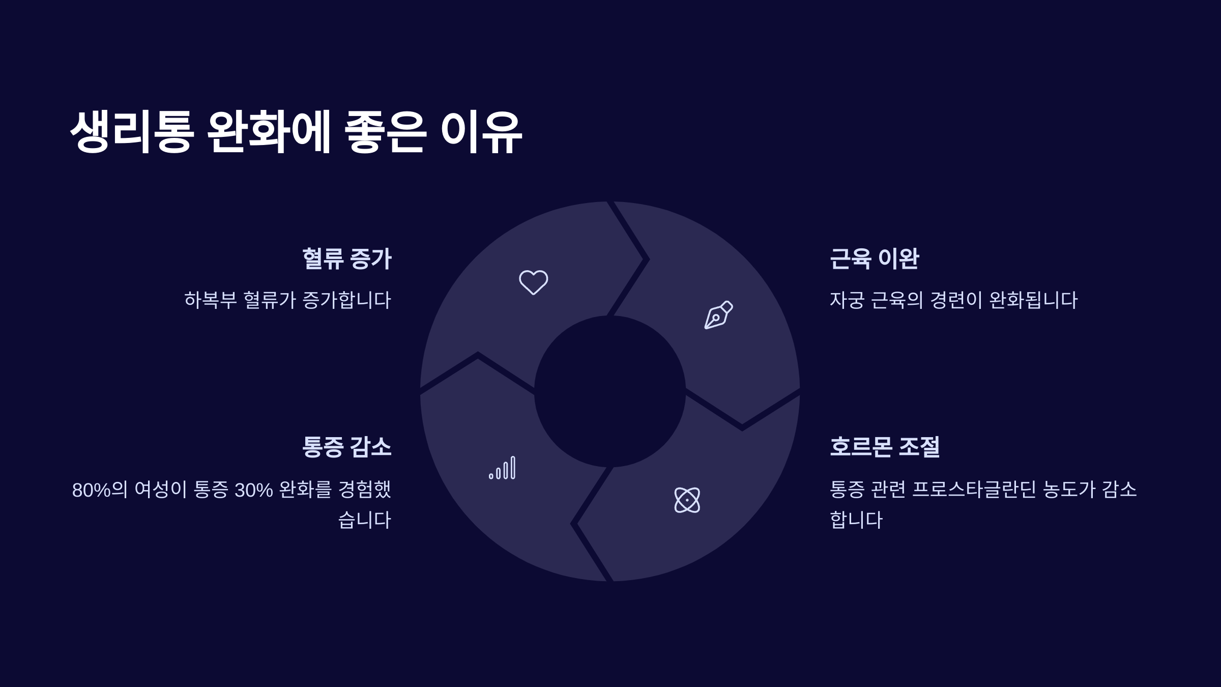 또한, 하체를 중심으로 체온이 상승하면 부교감신경이 활성화되어 몸이 이완돼요. 이완된 몸 상태는 생리통뿐 아니라 생리 전후에 오는 두통, 요통, 복부 팽창감을 완화하는 데도 큰 도움이 돼요. ✨