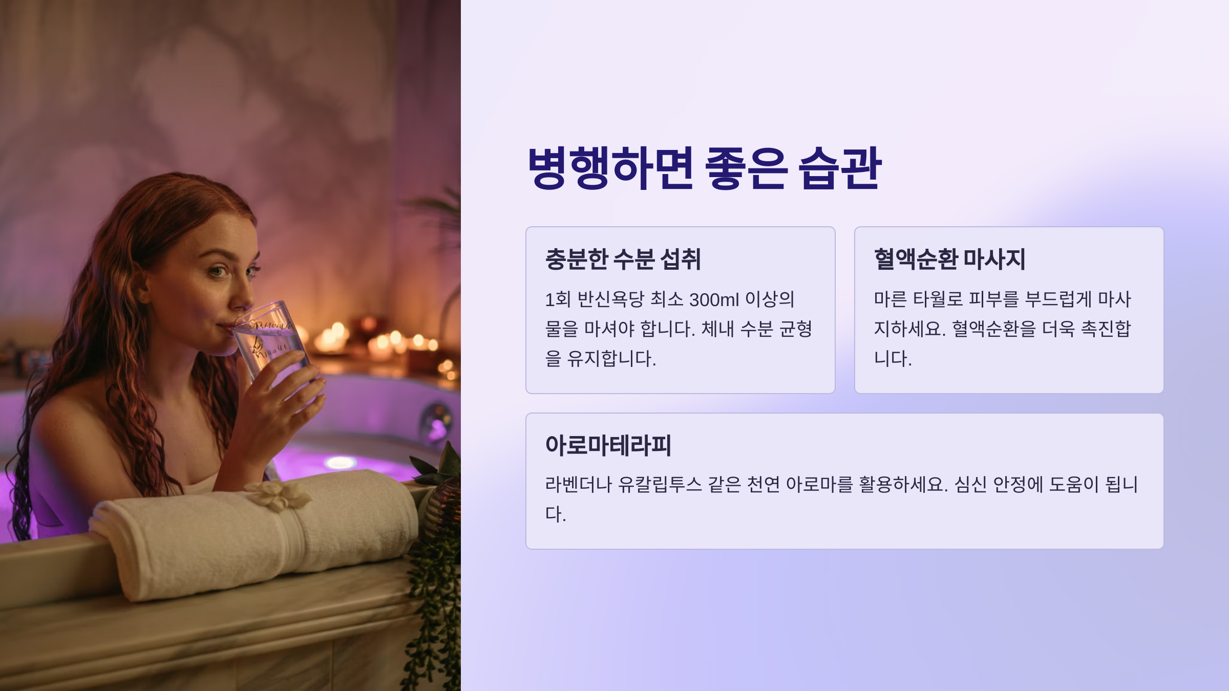 또, 시간이 부족한 날은 짧은 족욕으로 대체하고, 여유가 있는 날은 15~20분 반신욕을 해주는 것도 아주 좋아요. 이렇게 유연하게 조정하면 스트레스 없이 습관을 유지할 수 있답니다. ✨