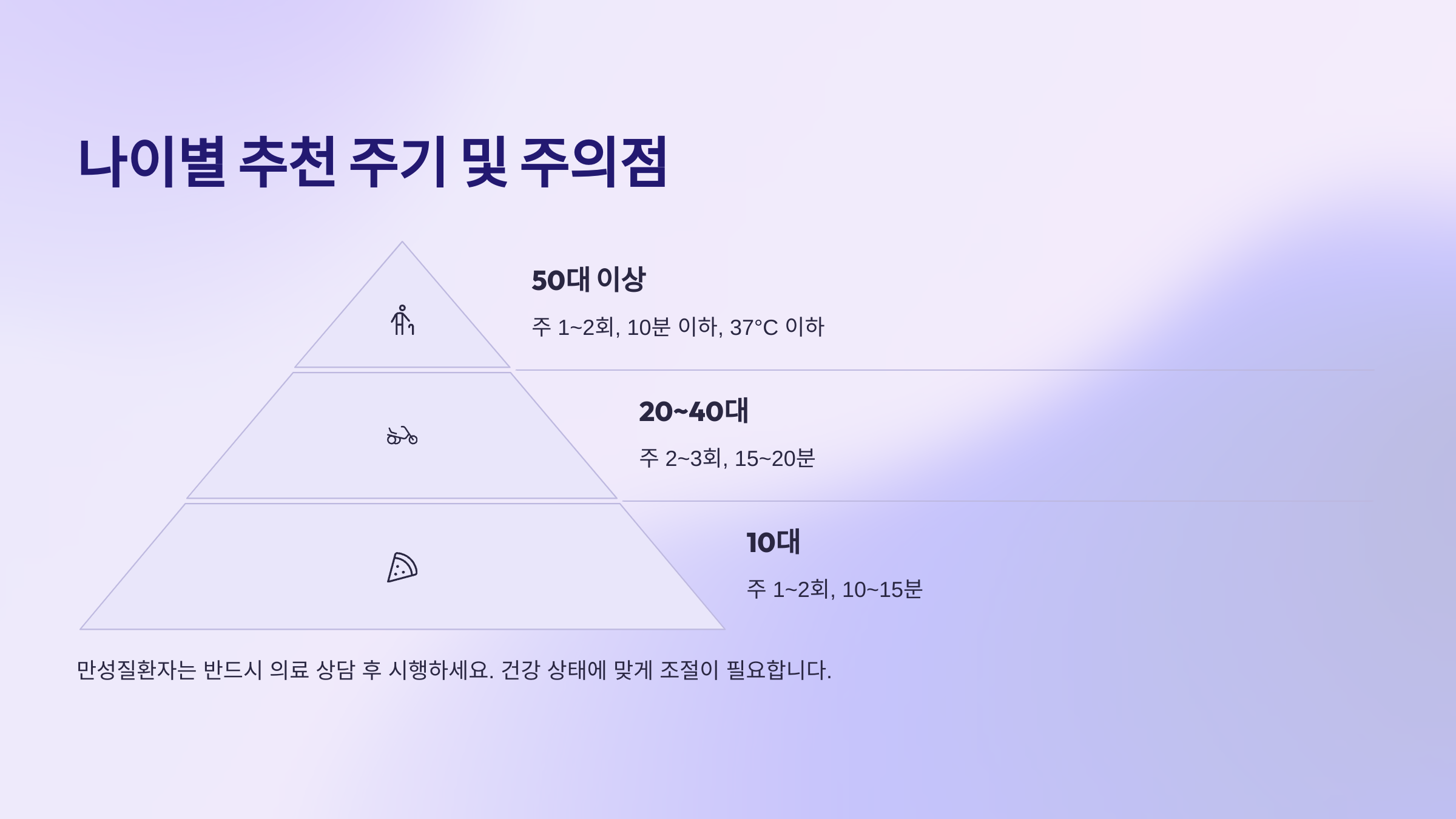 60대 이상 고령층은 심혈관 건강을 고려해 주 2~3회 정도로 횟수를 줄이고, 온도도 약간 낮춰서 안전하게 즐기는 게 좋아요. 건강 상태에 따라 족욕 위주로 하는 것도 좋은 방법이에요. 🧓👵