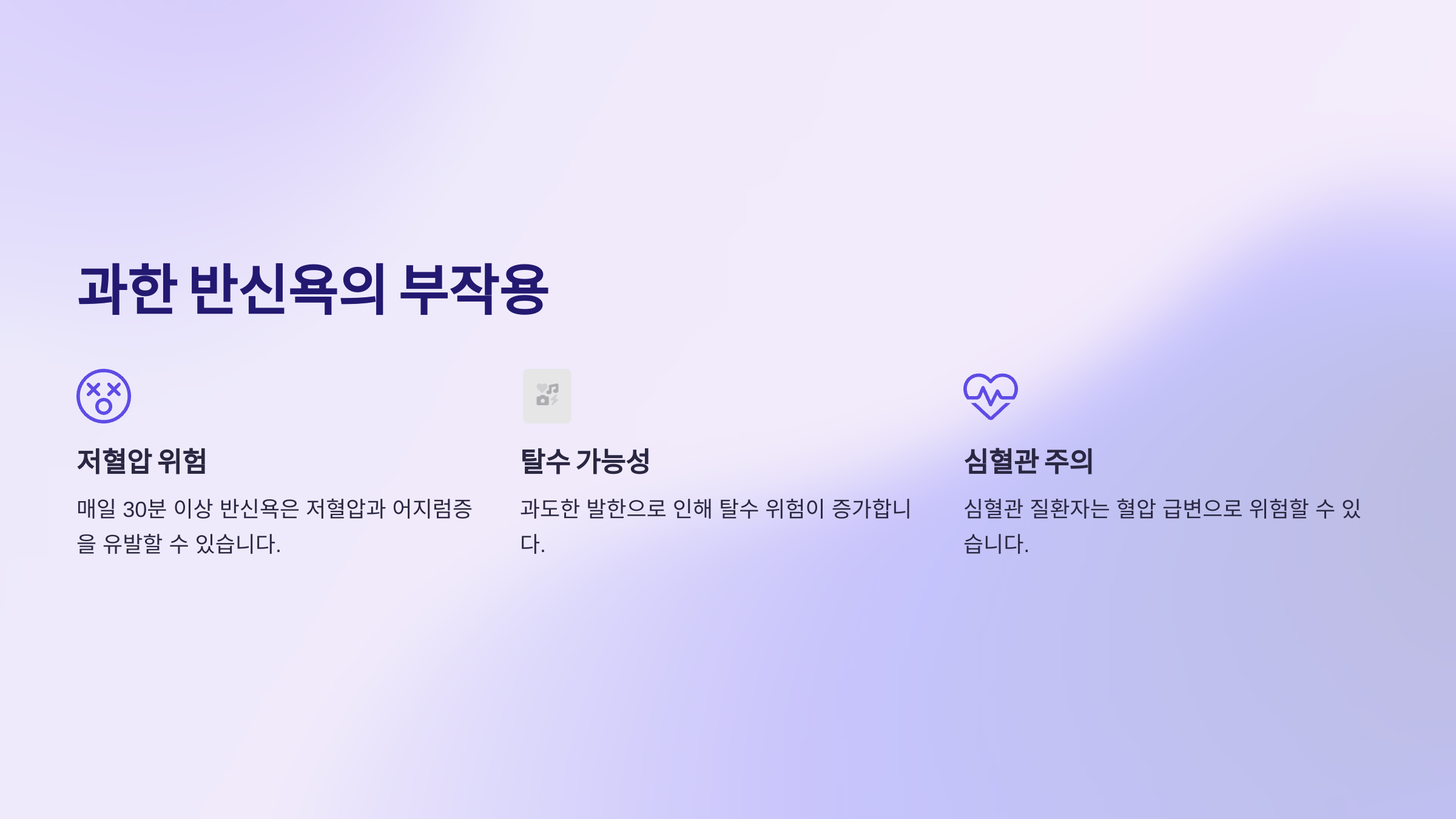 첫 번째로 주의할 점은 혈압 저하예요. 물 온도가 너무 높거나, 반신욕 시간이 너무 길면 혈관이 확장되면서 혈압이 급격히 떨어질 수 있어요. 어지러움이나 두통을 느끼는 경우도 있죠. 🚿