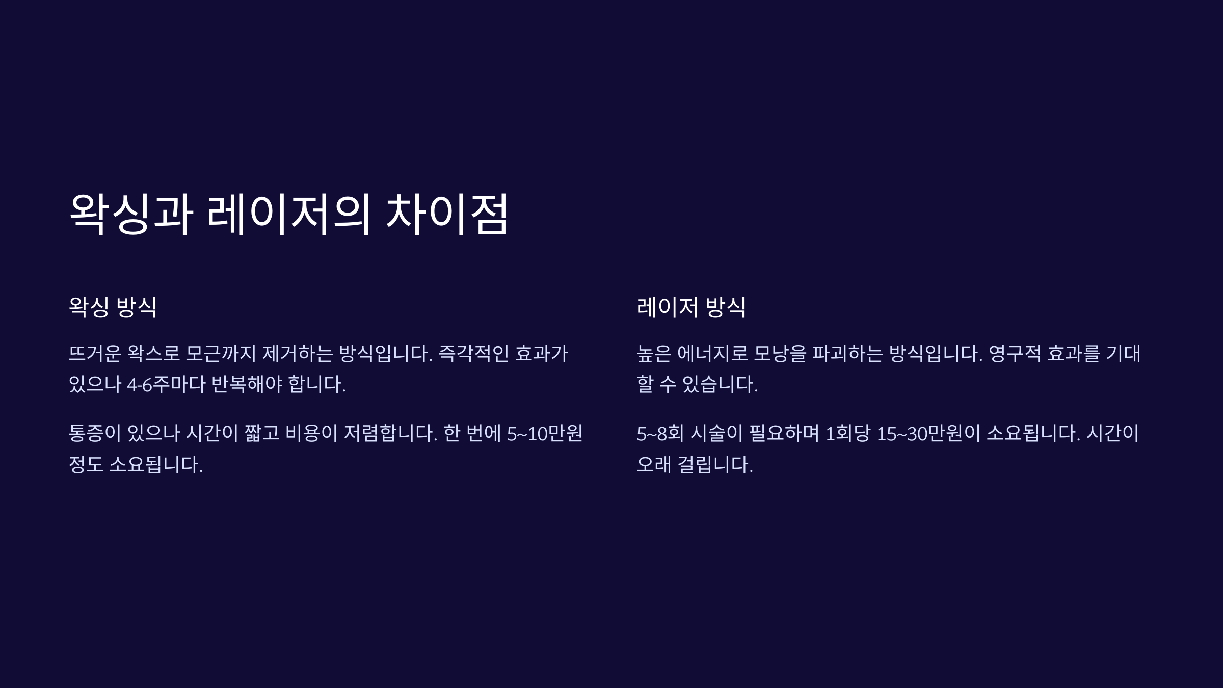 | 왁싱 | 털을 뿌리째 뜯음 | 즉각 효과, 유지기간 2~4주 |