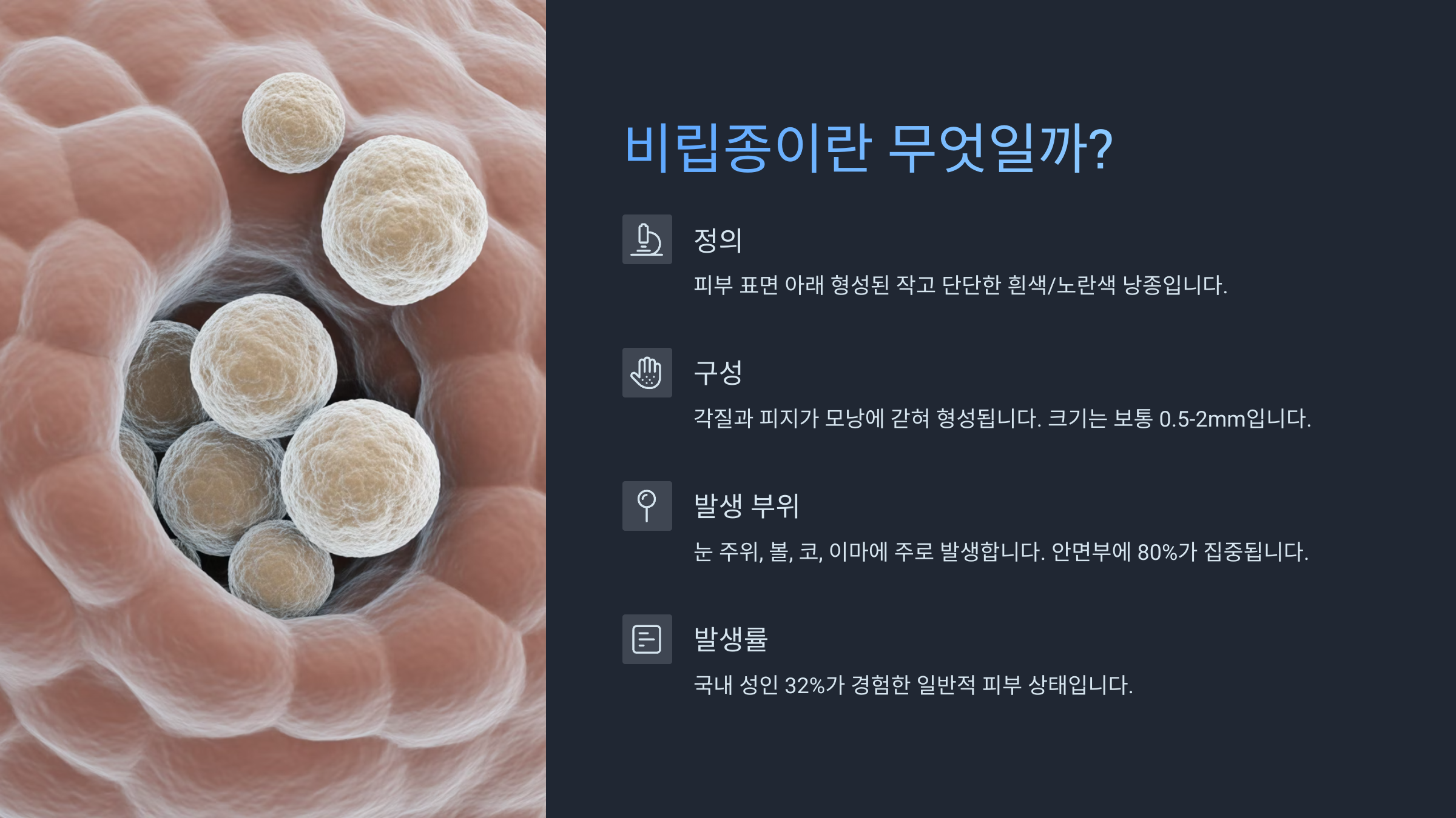 비립종은 일반적으로 '좁쌀 여드름'이라 오해받지만, 사실 전혀 다른 종류의 피부질환이에요. 피부 표면 아래에 단단하게 자리 잡은 작은 낭종으로, 주로 각질(케라틴)이 모공에 갇혀서 생기죠.