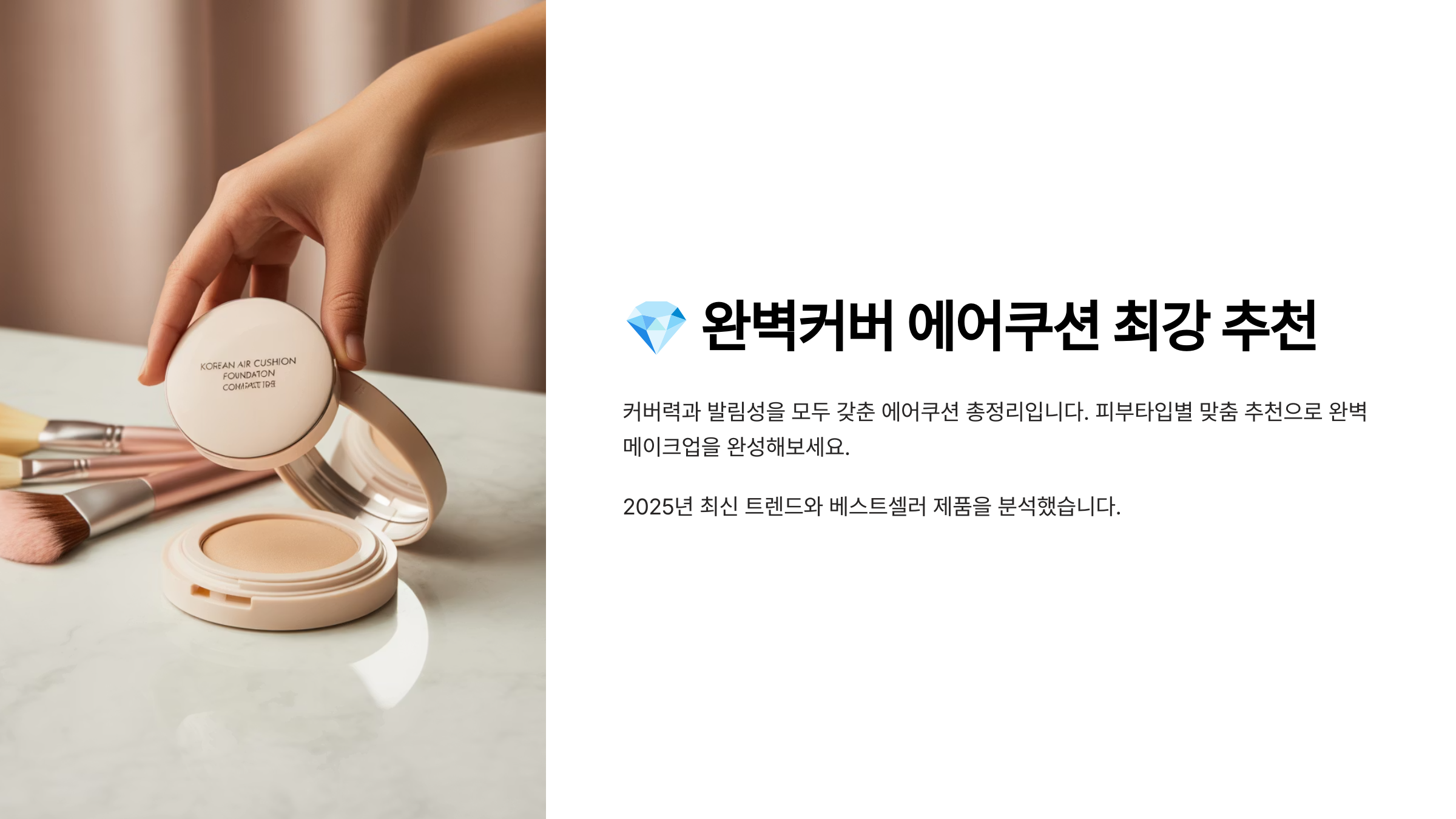 그래서 오늘은! 완벽커버 에어쿠션의 정의부터, 피부 타입별 추천 제품, 커버력 강한 BEST 아이템, 롱래스팅 팁까지 전부 소개해볼게요. 💡