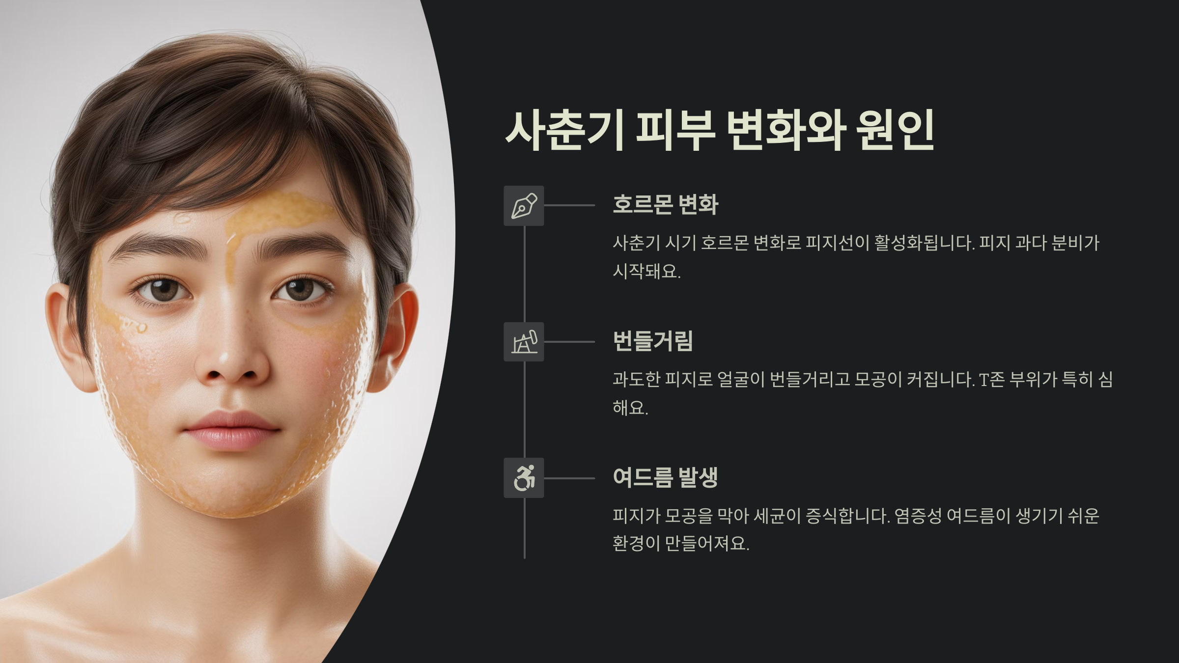 사춘기가 시작되면 우리 몸의 호르몬 분비가 활발해지면서 피부에도 많은 변화가 나타나요. 이 시기에 분비되는 안드로겐이라는 호르몬은 피지선의 활동을 자극해서 얼굴 전체에 유분이 증가하게 만들죠.