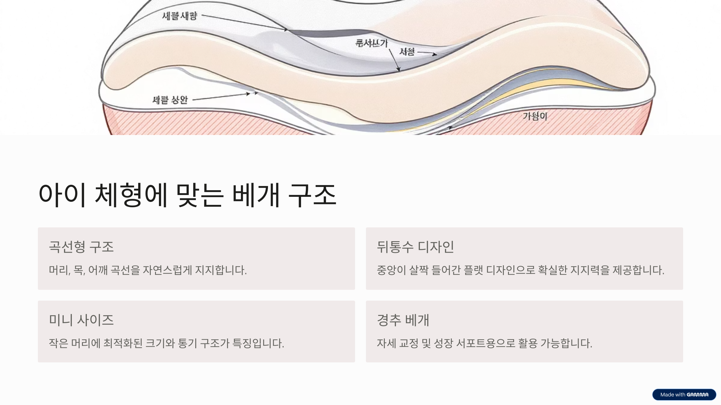 아이마다 어깨 너비, 목 길이, 머리 크기가 다 다르기 때문에 베개의 구조 또한 정형화된 것보다 맞춤형 접근이 필요해요. 특히 성장기 아이들의 척추는 유연하고 민감해서 베개의 구조에 민감하게 반응해요.