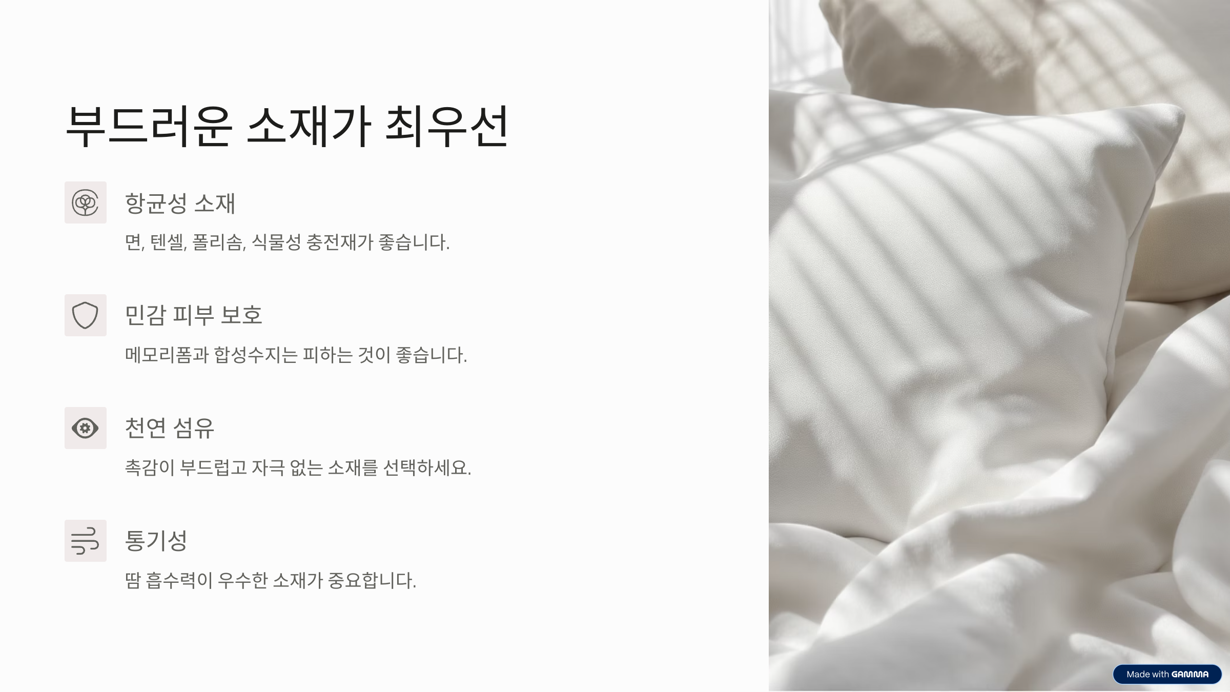 아이 피부는 매우 예민하고 땀이 많기 때문에, 베개의 소재는 무엇보다 부드러워야 해요. 특히 얼굴이 직접 닿는 부분은 순면 100% 또는 오가닉 코튼을 사용하는 것이 좋아요.