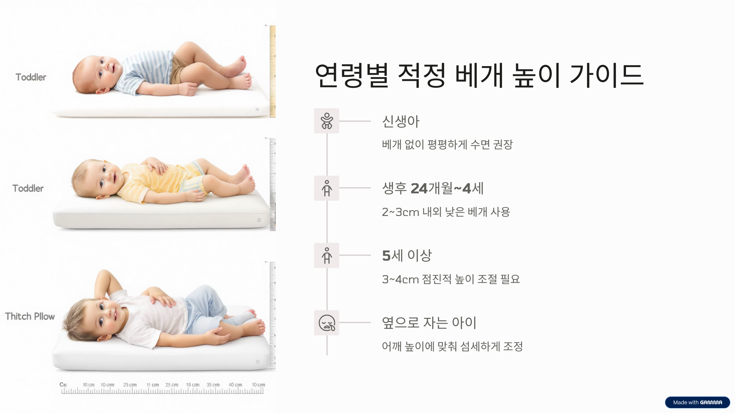 아이의 나이에 따라 목의 구조와 척추 정렬이 달라지기 때문에 베개 높이도 달라야 해요. 신생아부터 초등학생까지 성장 단계마다 최적의 높이를 적용해야 목에 무리가 가지 않고 숙면을 취할 수 있답니다.