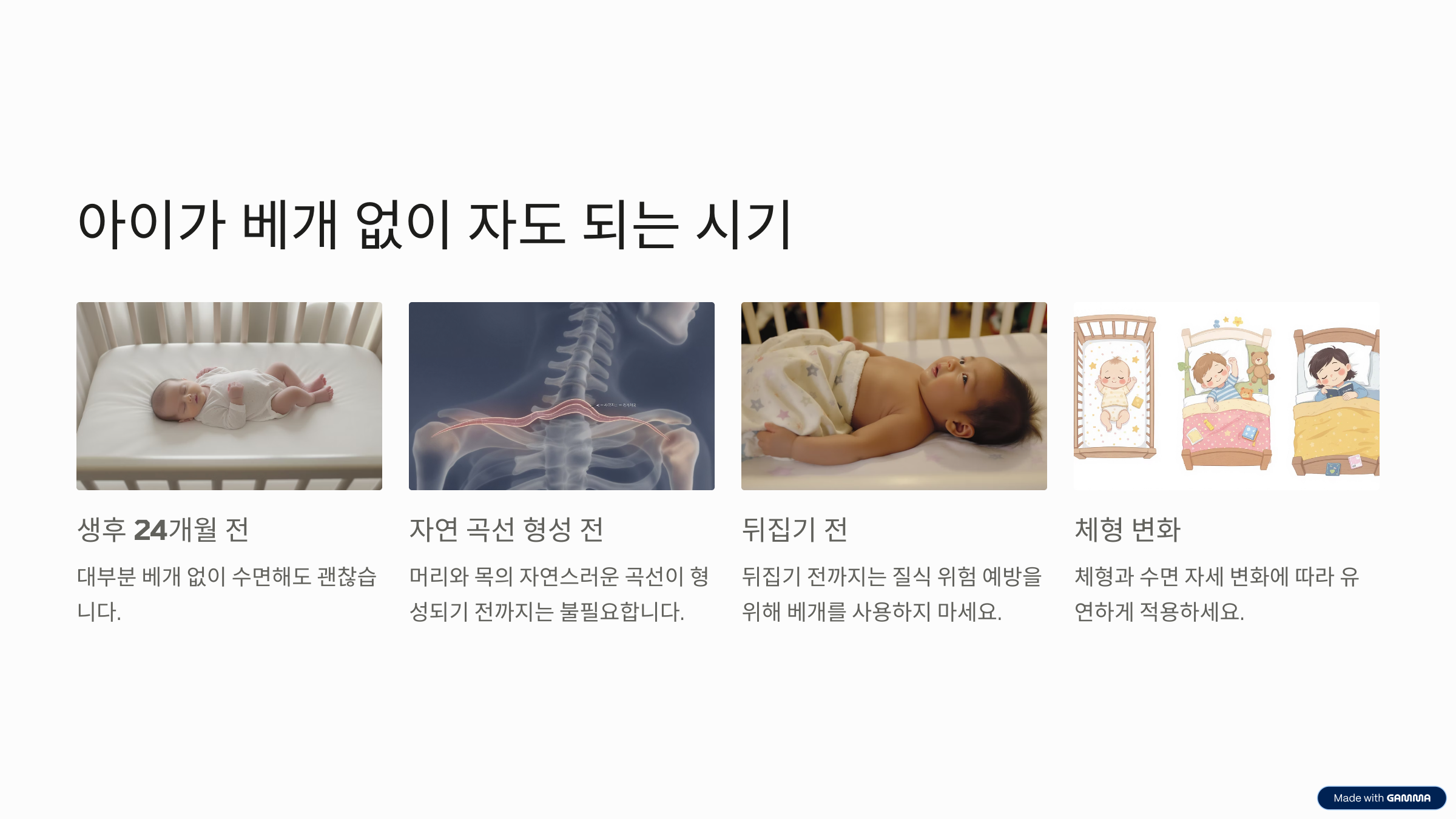 아이마다 발달 속도가 달라서 정해진 시기보다는 발달 상태에 맞게 베개 유무를 결정하는 게 좋아요. 일반적으로 생후 12개월까지는 베개 없이 자는 것이 추천돼요.