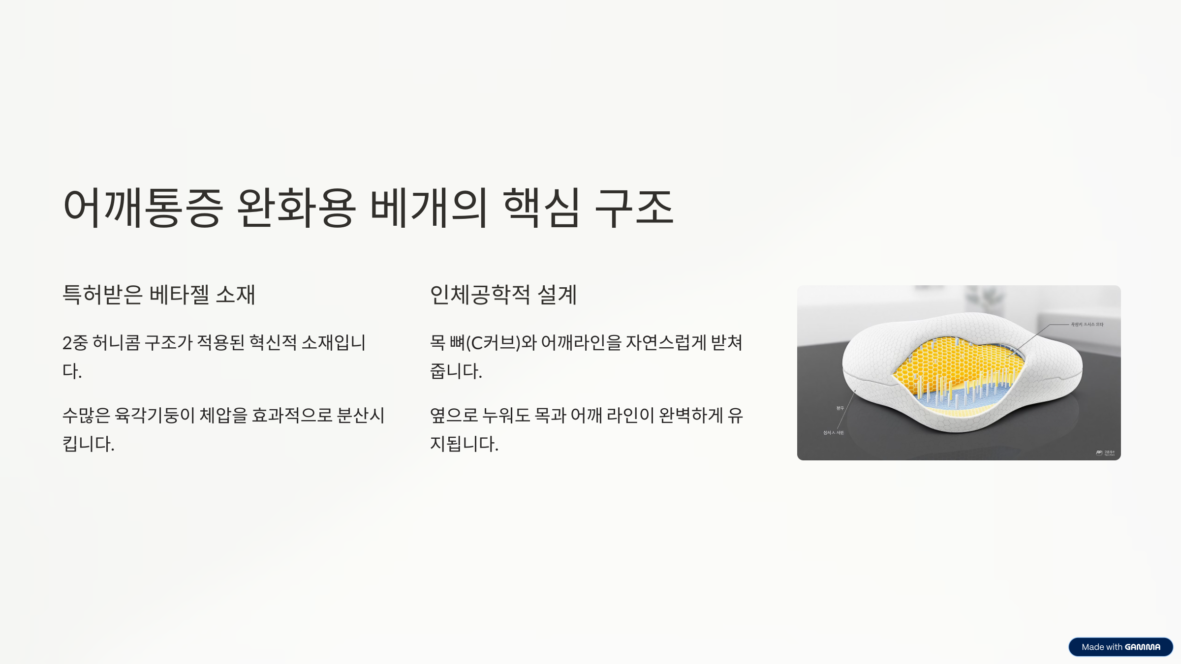 어깨 통증 완화를 위한 베개는 일반적인 베개와 구조부터 다르게 설계되어 있어요. 가장 중요한 포인트는 바로 '경추의 자연스러운 커브'를 유지하는 것이에요. 인체공학적으로 목과 어깨가 자연스럽게 이어지는 구조를 가진 베개는 경직된 근육을 부드럽게 풀어주고, 피로 회복에도 효과적이랍니다.