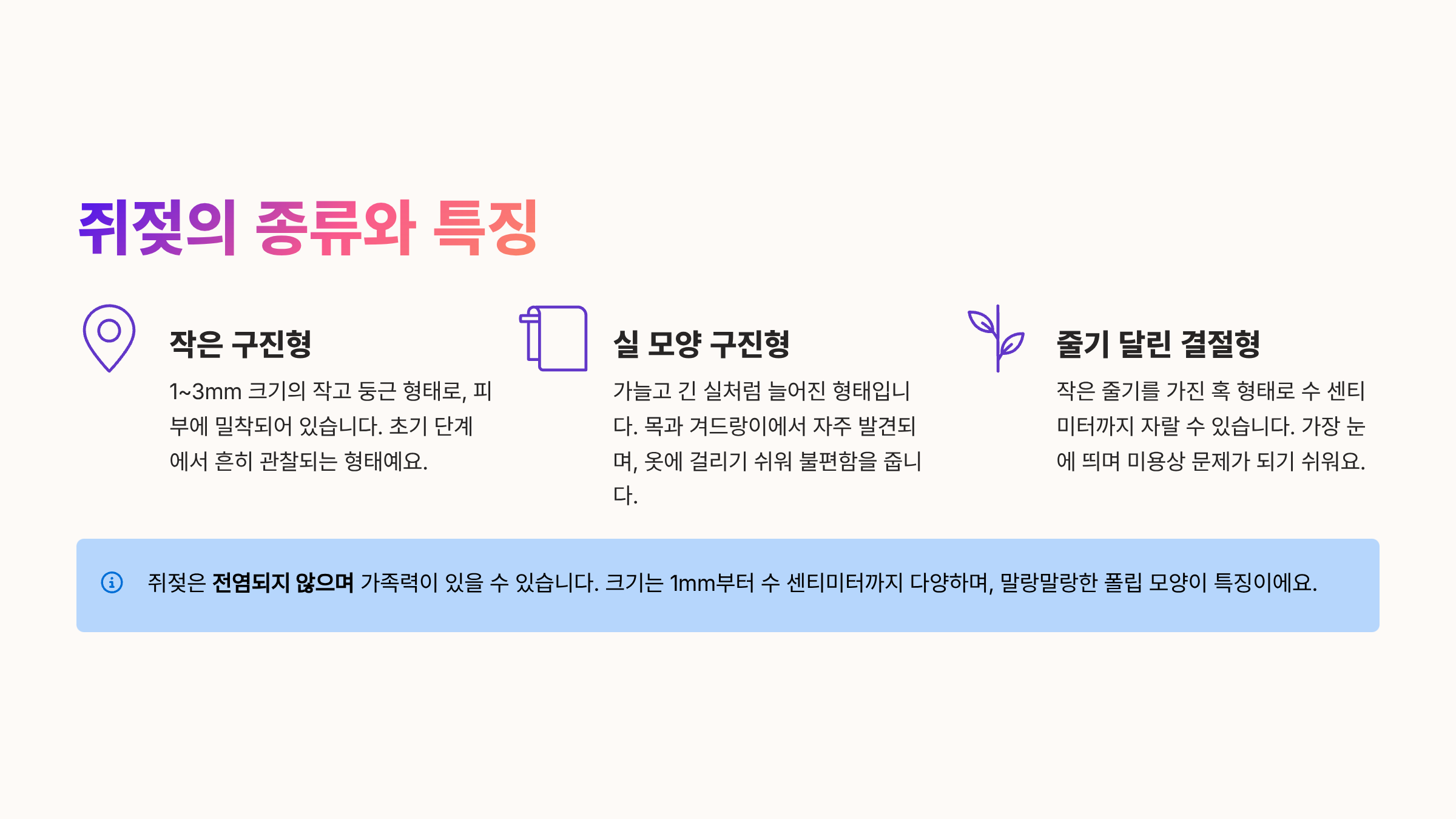 ⚠️ 주의하세요! 집에서 자가 진단을 통해 쥐젖을 제거하려다 오히려 편평사마귀를 잘못 건드려 온몸에 퍼뜨리는 경우가 있습니다. 이는 바이러스 질환의 특성상 발생할 수 있는 위험이므로, 반드시 정확한 진단이 선행되어야 합니다.
