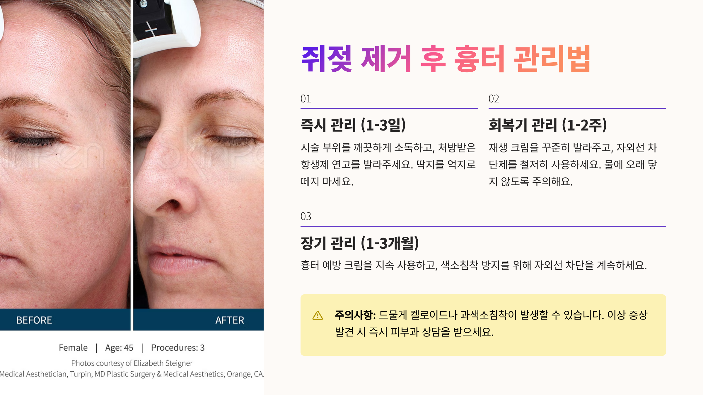 ⚠️ 주의하세요! 시술 후 붉은기는 2주 정도 지속될 수 있으며, 딱지가 떨어진 후에도 붉은 자국이 남을 수 있습니다. 이는 자연스러운 회복 과정이며, 재생 크림과 자외선 차단제를 꾸준히 사용하면 대부분 사라지니 너무 걱정하지 않아도 됩니다.