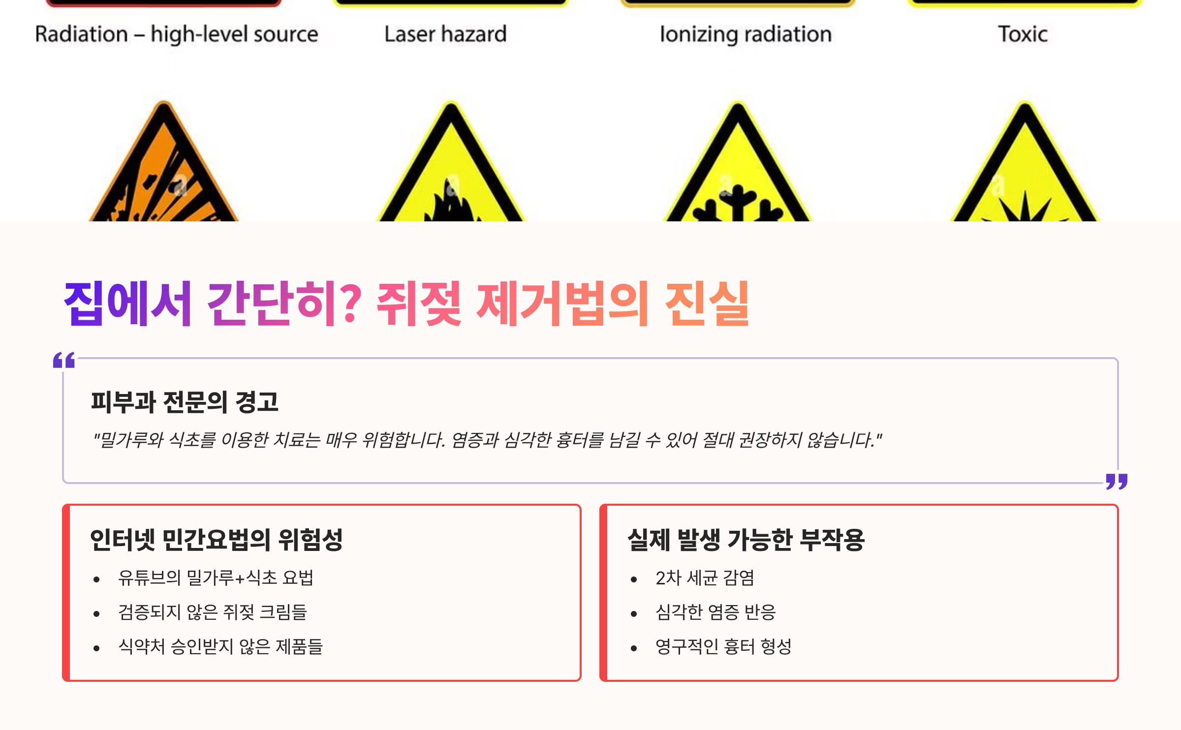 ⚠️ 주의하세요! 식약처에 따르면, 국내에서 쥐젖 제거 효과를 인정받은 화장품이나 의약외품은 아직 없습니다. 온라인에서 판매되는 '쥐젖 제거 크림' 등의 제품 광고는 불법이므로 주의해야 합니다. 안전과 효과가 검증되지 않은 제품 사용은 오히려 피부 건강을 해칠 수 있습니다.