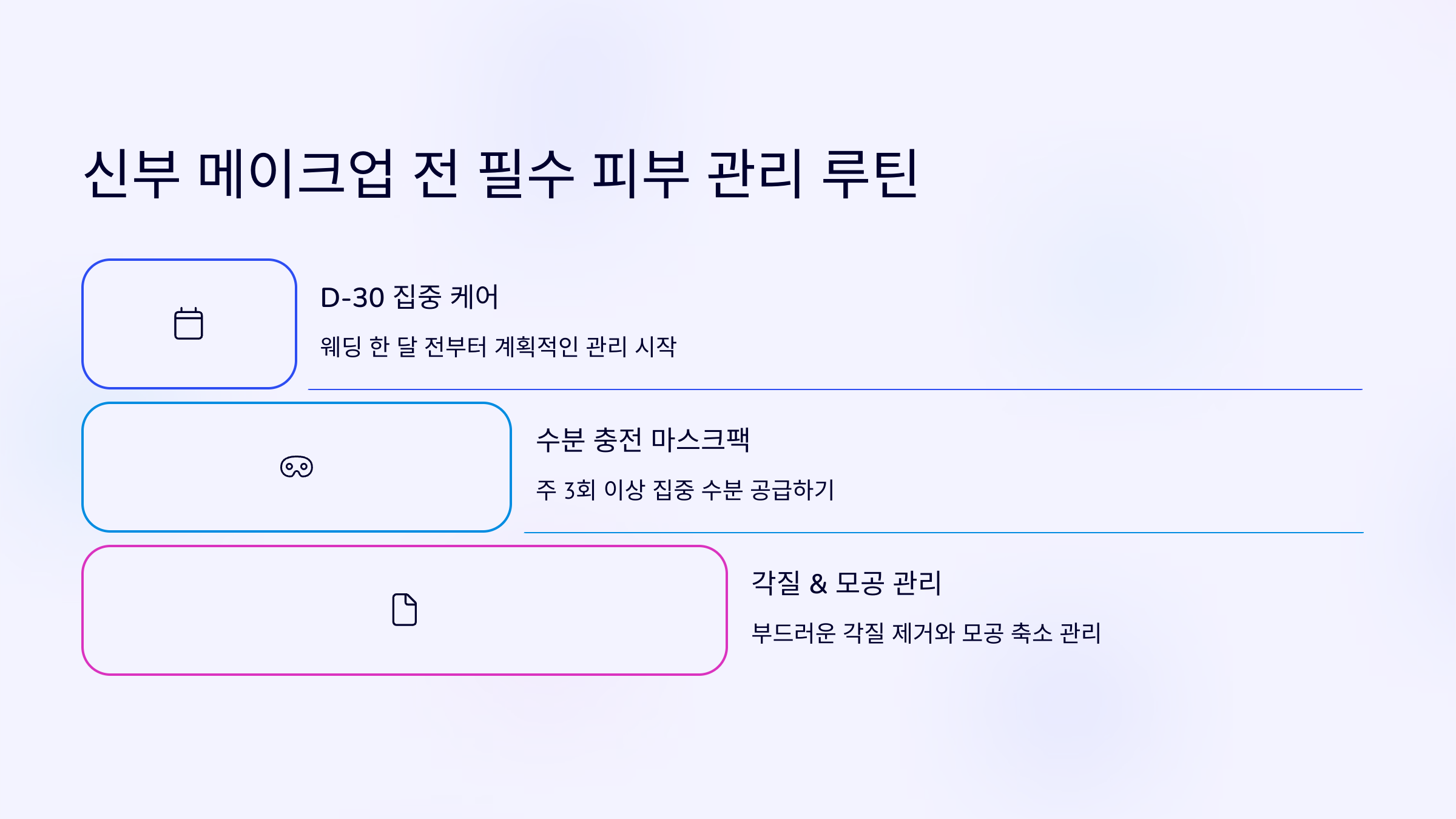 예식 당일 완벽한 피부로 메이크업을 받기 위해선 지금부터가 진짜 시작이에요. 피부는 거짓말하지 않아요—관리한 만큼 빛나게 되어 있어요! 🌟