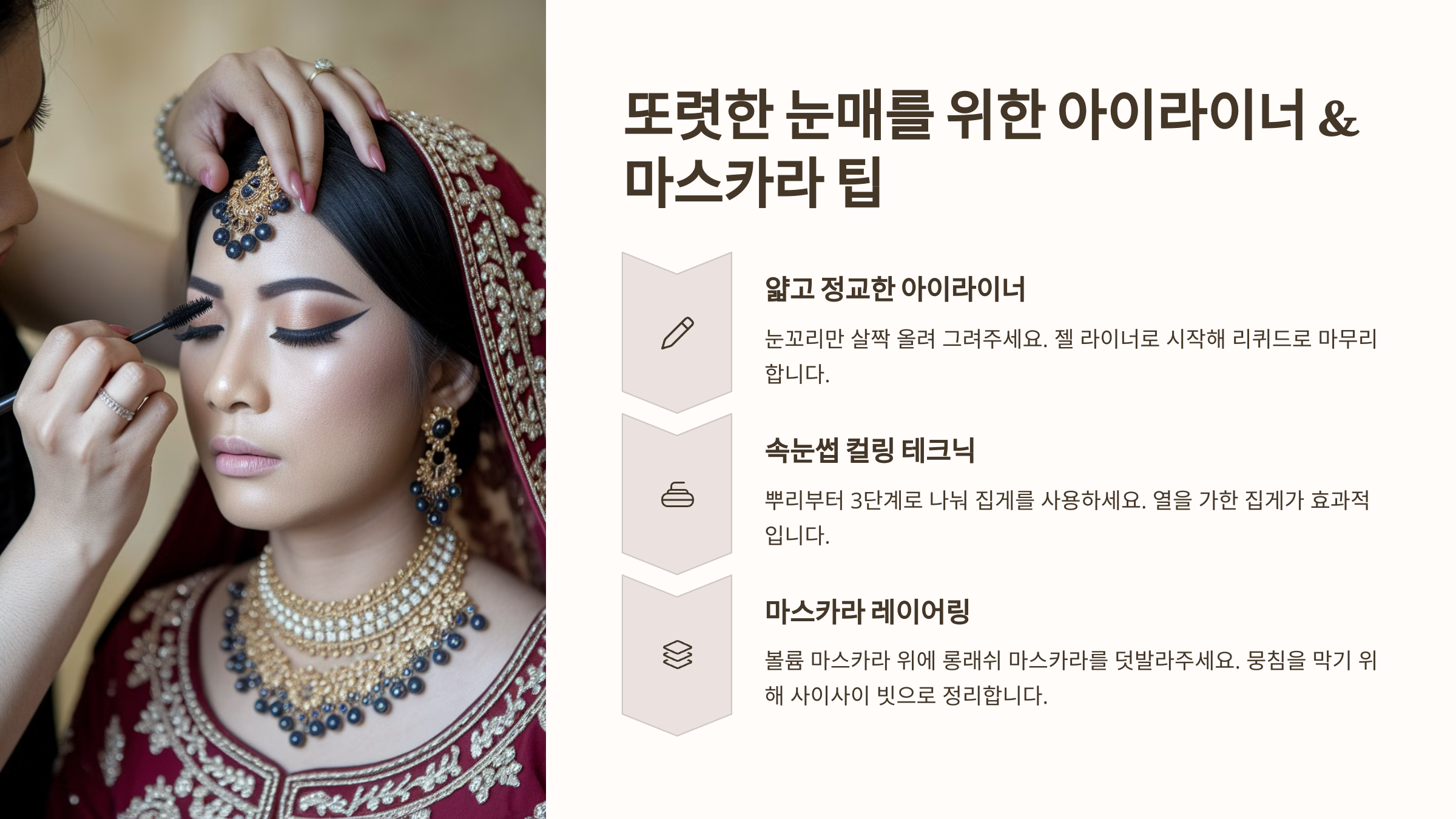 이제는 아이메이크업이 단순히 눈만 강조하는 게 아니라, 전체 웨딩 무드에 맞춰 설계된다는 점이 중요해요. 눈매 하나로 신부의 분위기 전체가 바뀔 수 있기 때문에, 디테일한 스타일링이 더욱 주목받고 있어요.