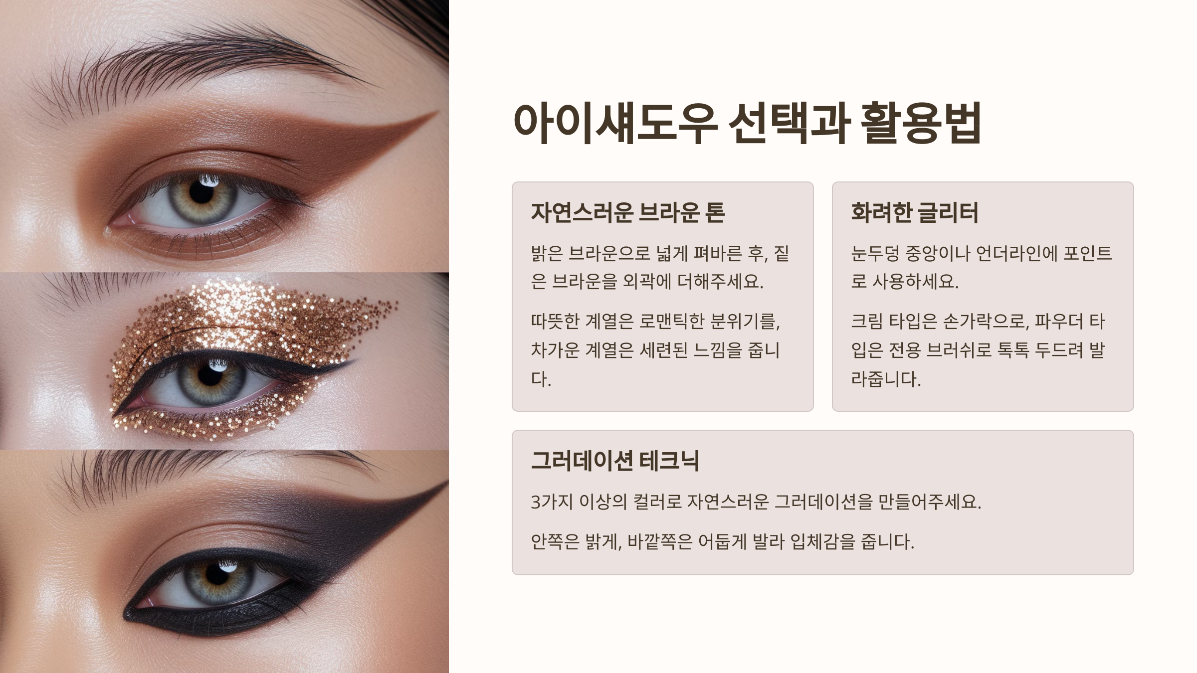 요즘은 섀도우 하나만 쓰기보다 매트 + 쉬머 + 글리터를 조합해 쓰는 게 일반적이에요. 눈두덩은 매트, 애교살은 쉬머, 눈앞머리는 글리터 이렇게 구역을 나눠주면 전문가처럼 보이는 입체 눈매를 연출할 수 있어요. 연습만 조금 해두면 누구나 할 수 있어요!