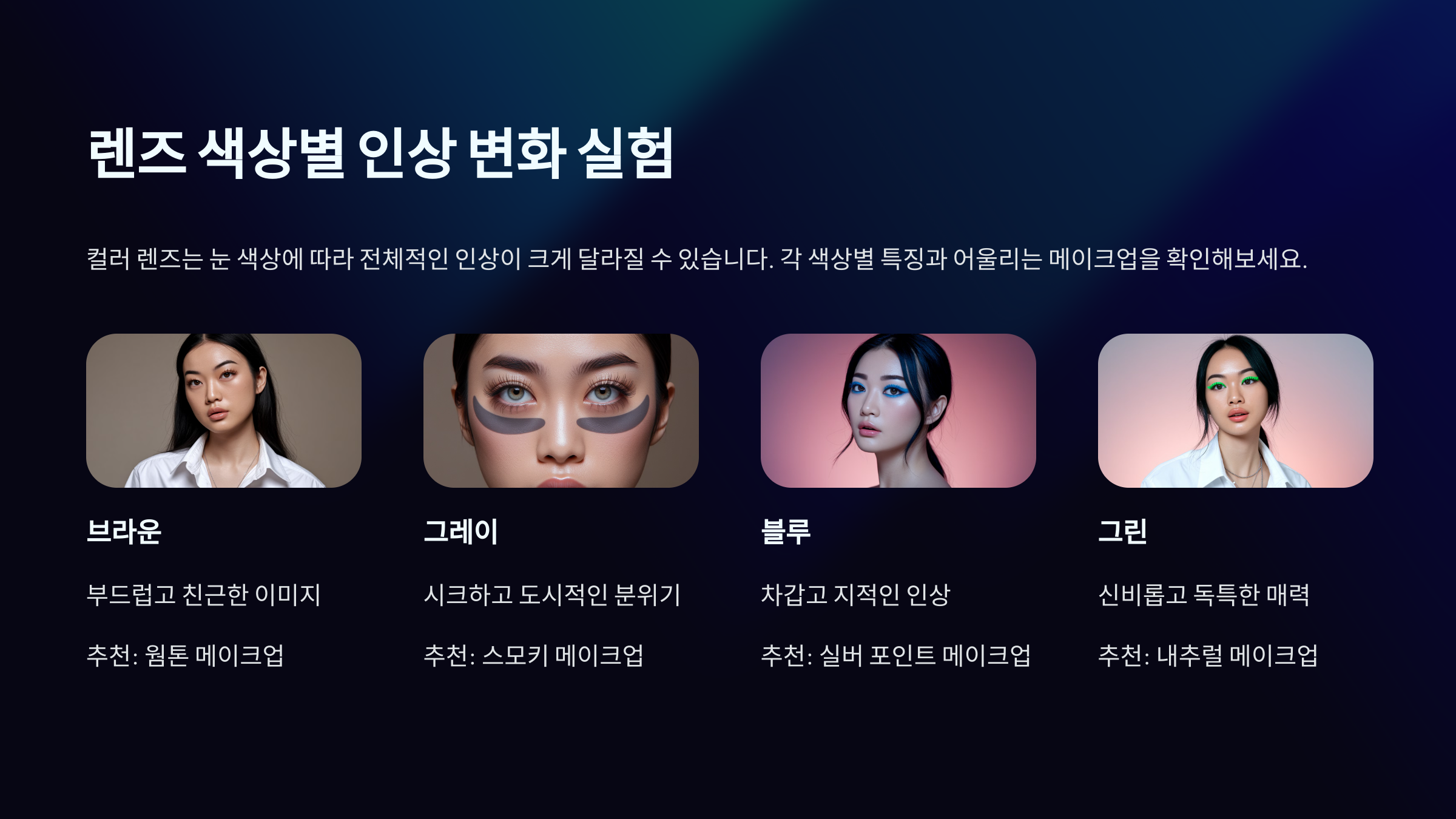 같은 사람이지만 렌즈 컬러 하나로 인상이 이렇게 달라질 수 있다는 점에서 정말 흥미롭죠?