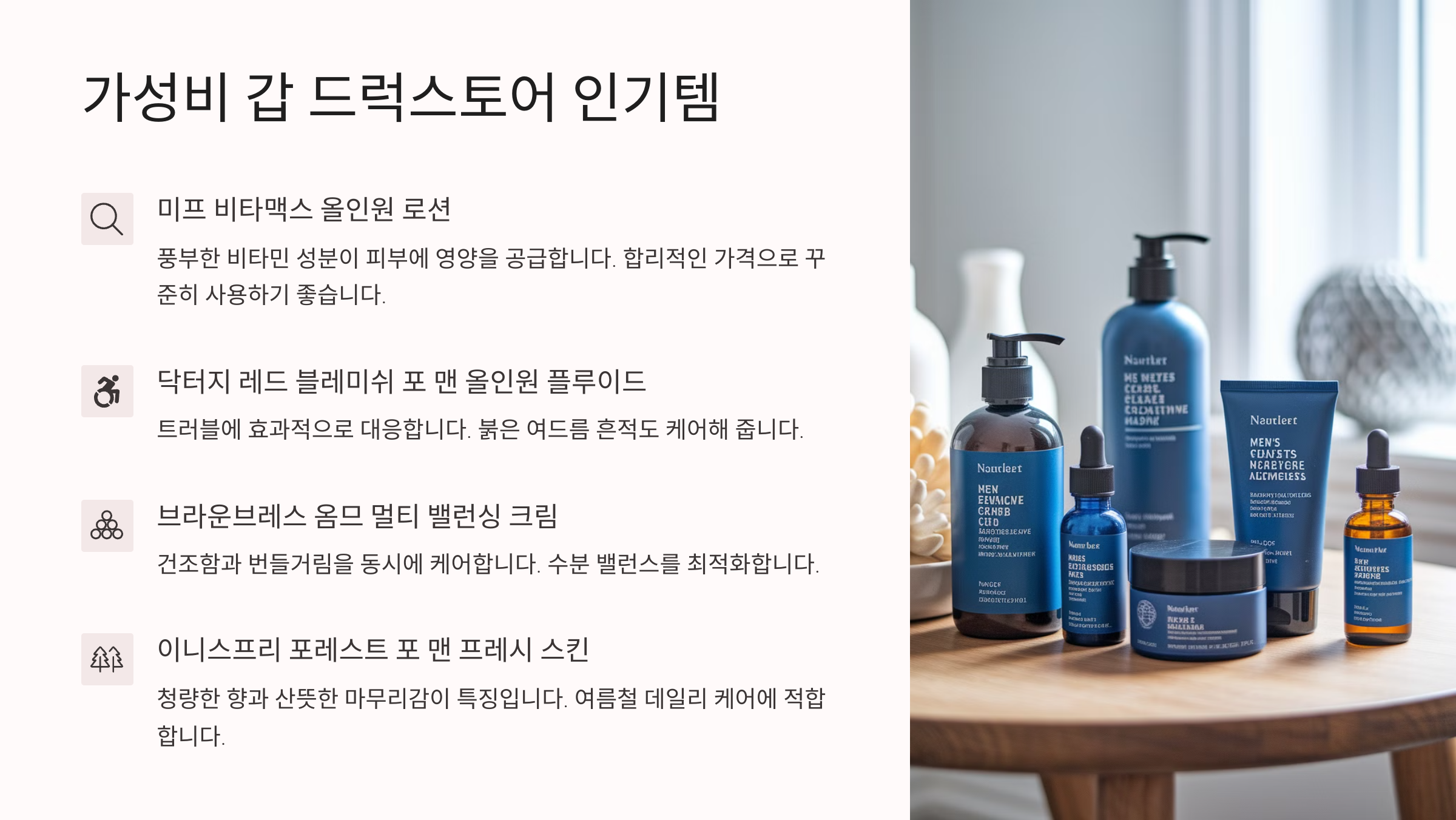 비싼 제품도 좋지만, 저렴하면서도 효과 좋은 ‘가성비 꿀템’이 요즘 더 인기예요! 특히 초보자들이 처음 남성 화장품을 시작할 때는 부담 없는 가격의 드럭스토어 제품이 최고죠. 😎