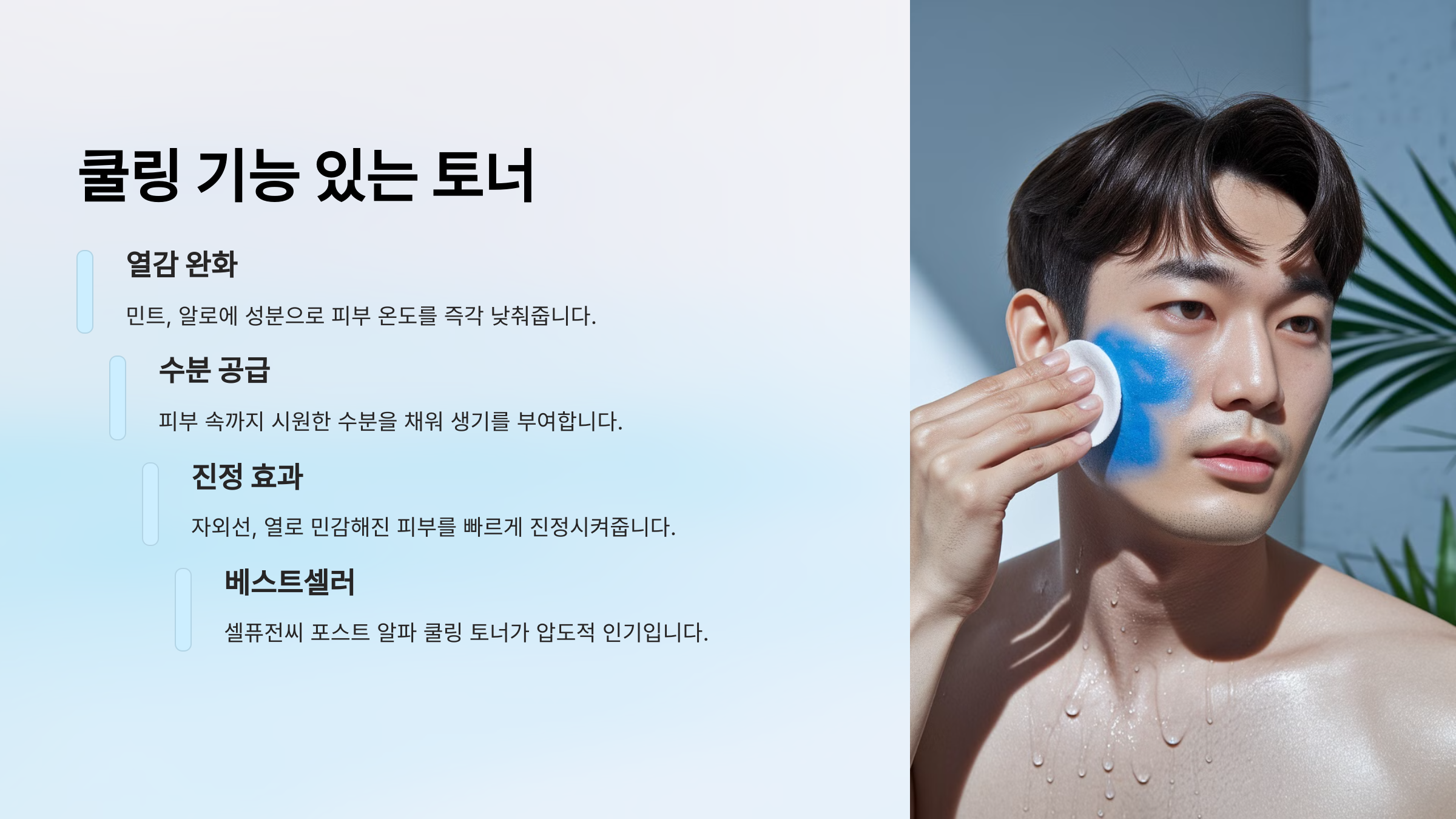 쿨링 토너는 열 오른 피부를 빠르게 진정시켜 주는 여름 필수템이에요. 남자 피부도 시원하게 케어해봐요 😎