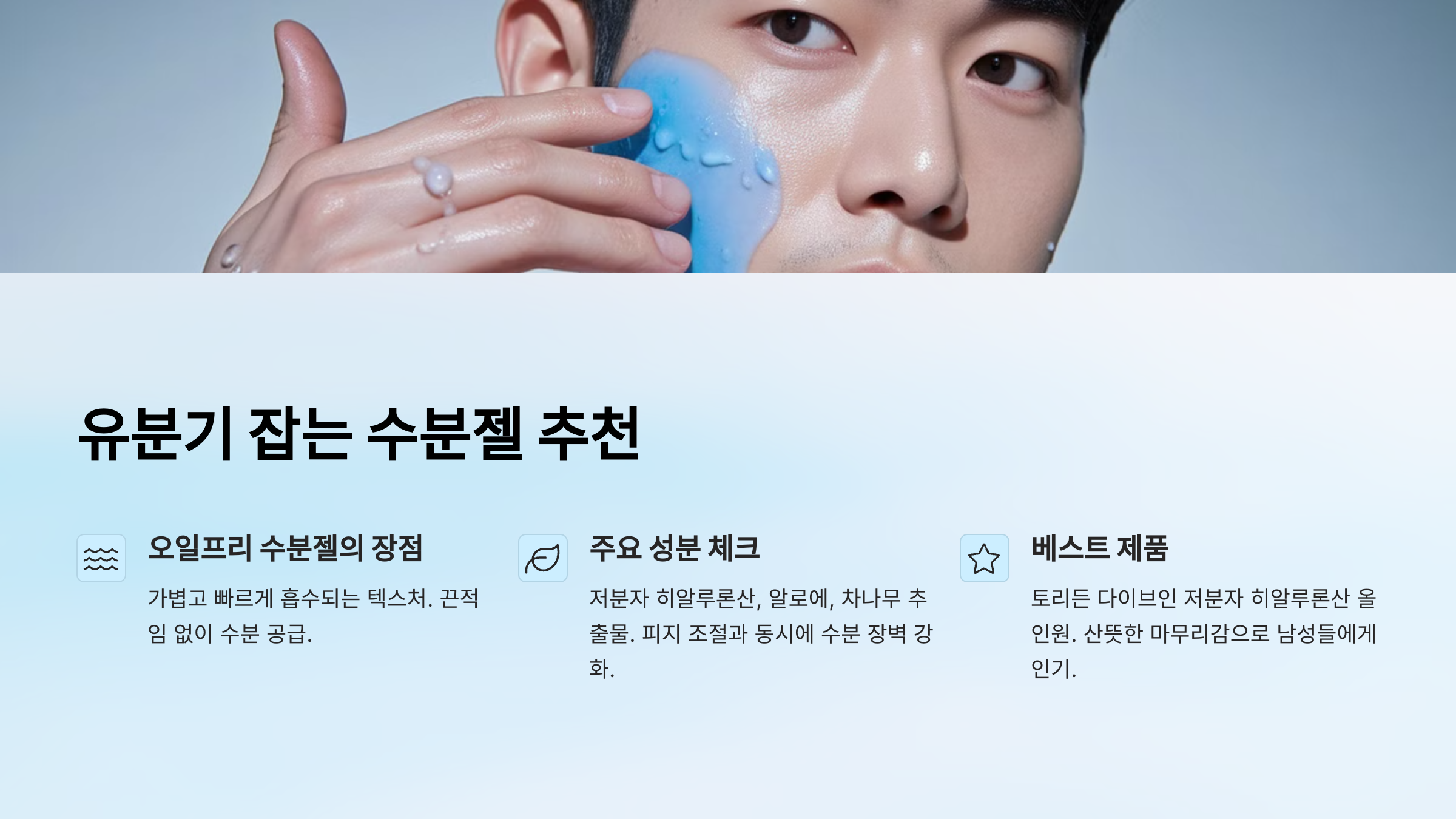 남성 피부는 유수분 밸런스를 맞춰주는 게 핵심이에요. 수분젤 하나만 잘 골라도 여름 피부 관리 절반은 성공이에요 🙌